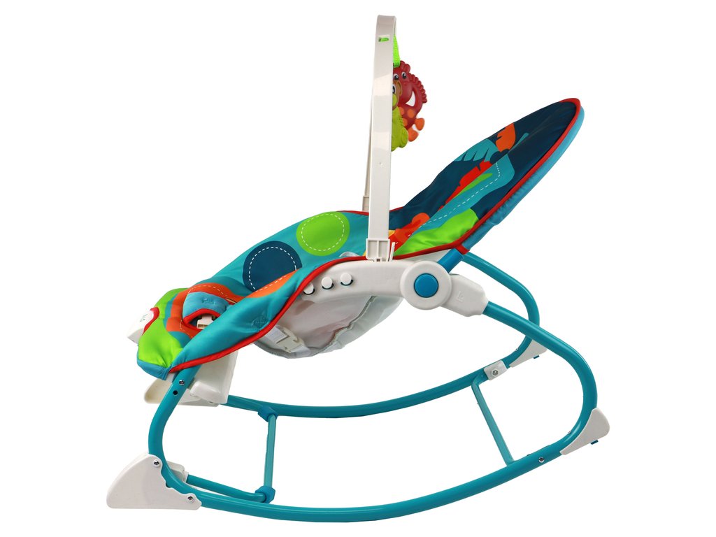 Този многофункционален шезлонг разполага и с регулируем наклон на облегалката, което позволява индивидуално адаптиране към нуждите на детето. Зелените и сини цветове създават приятна и уютна среда. Освен това, чрез разгъване на синята крачка, шезлонгът може да се превърне в стабилен стол.
