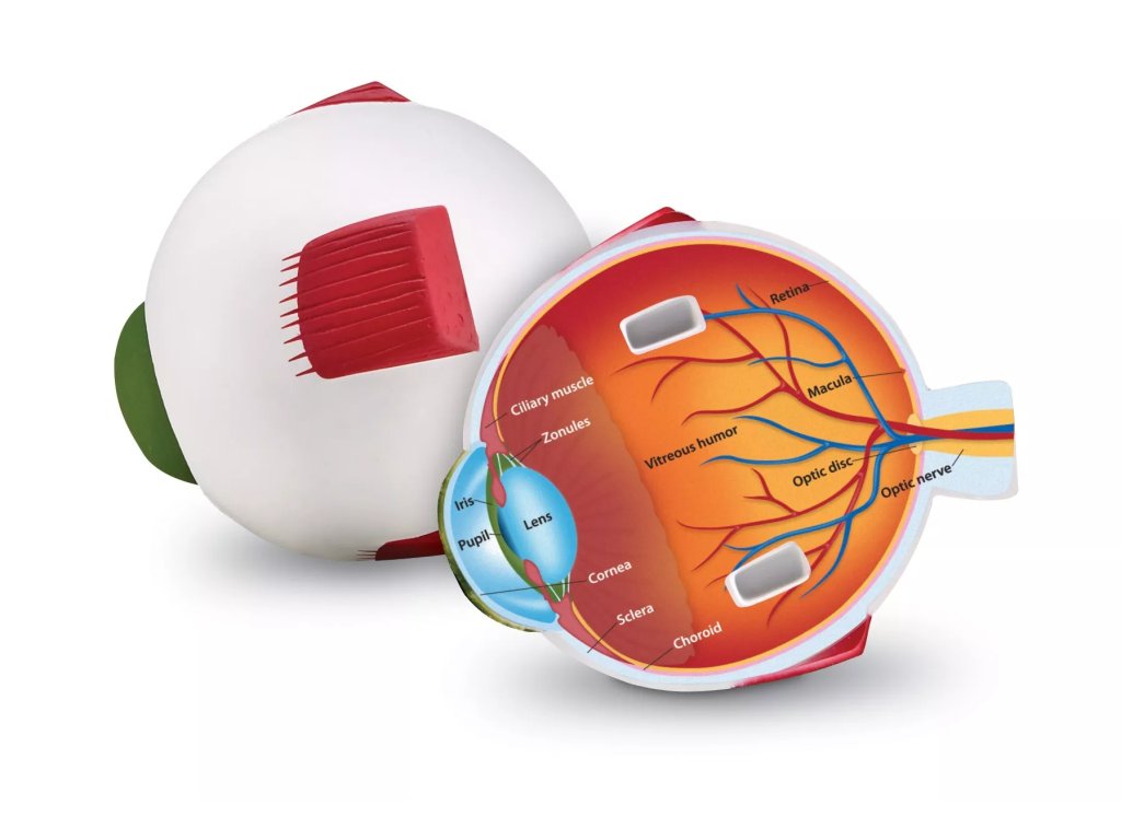 Моделът е с приблизителен размер 12,5 cm и е изработен от мека пяна. След отваряне се виждат вътрешните части на окото, които са описани на английски в едната половина; другата половина съдържа означения с букви за присвояване.