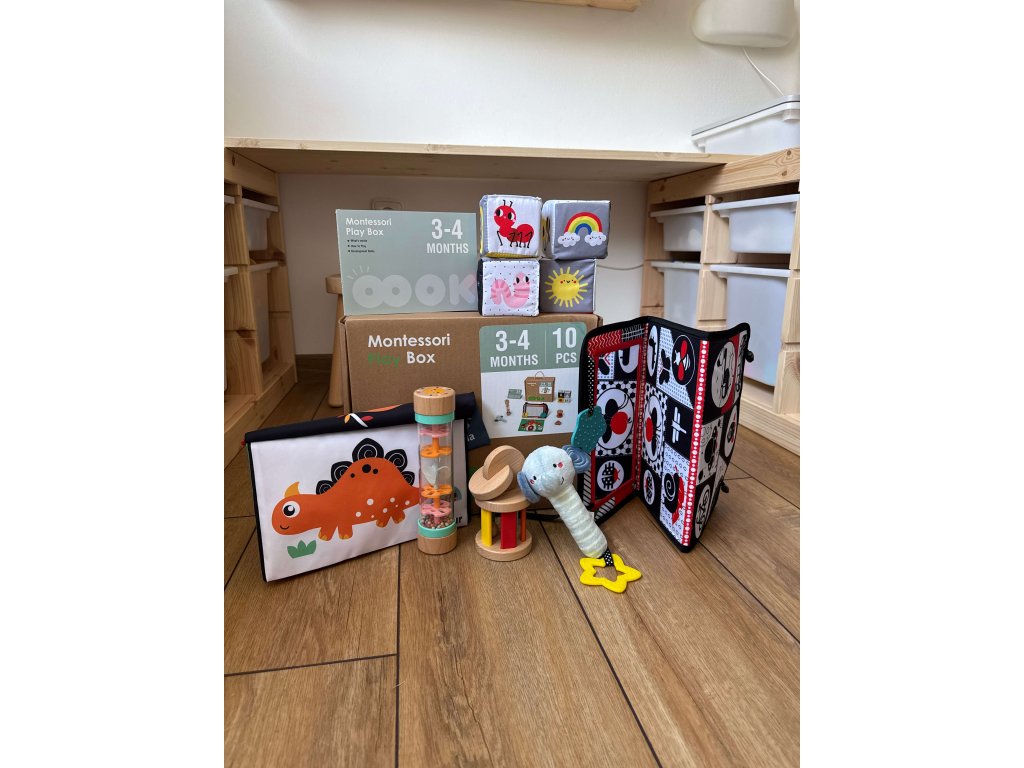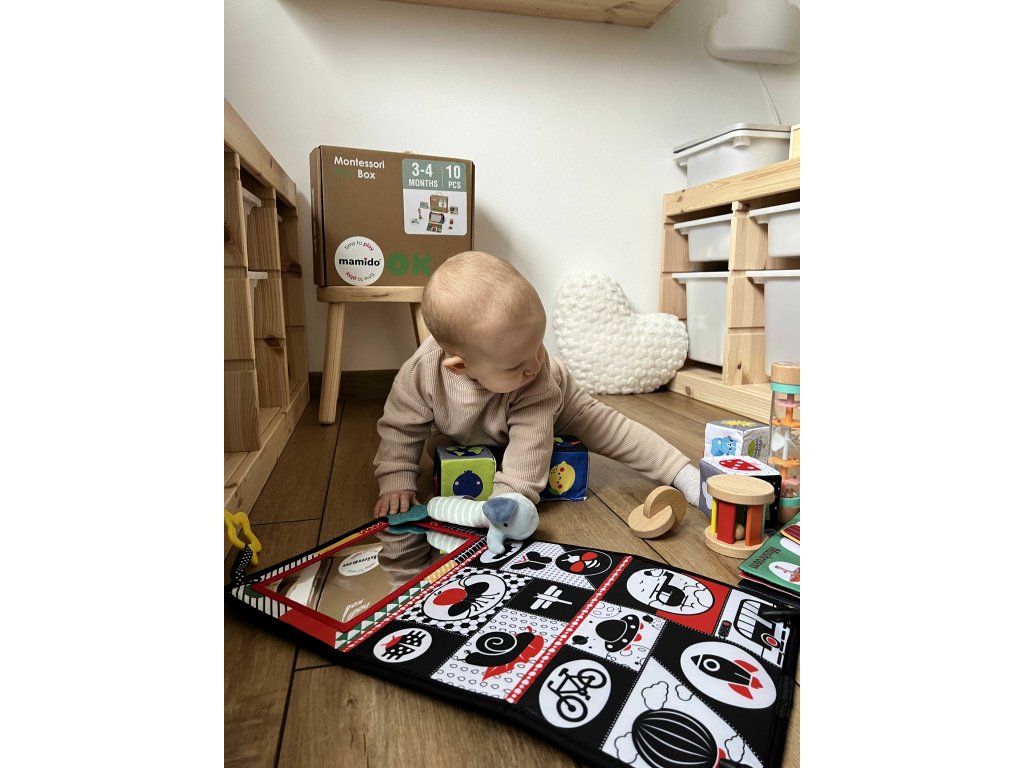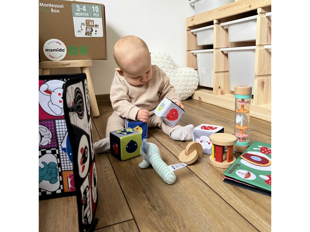 Открийте Монтесори кутия XXL 10 бр. Тактилни кубчета Огледало Музикални инструменти Сензорика 3-4 месеца, създадена специално за деца от 3 до 4 месеца, с цел стимулиране на сетивното и моторно развитие на вашето бебе. Тази кутия съдържа 10 внимателно подбрани играчки, които подпомагат координацията между ръце и очи, слуха и докосването. Комплектът включва тактилни кубчета, огледало, музикални инструменти и други интерактивни елементи. Всички играчки са изработени от качествени, безопасни и екологични материали, които са щадящи за деликатната кожа на бебето.