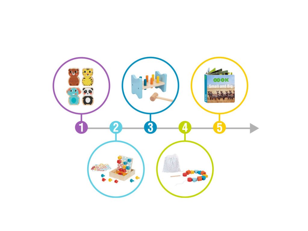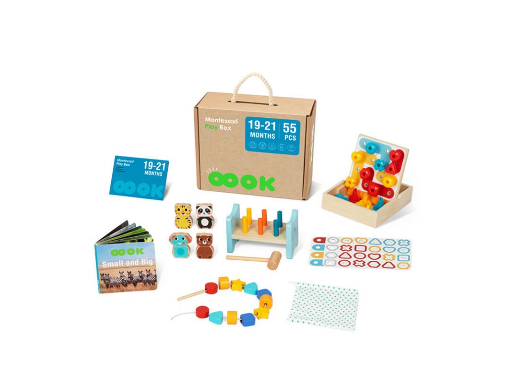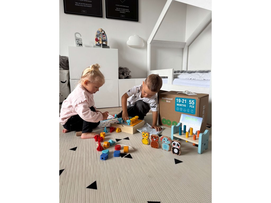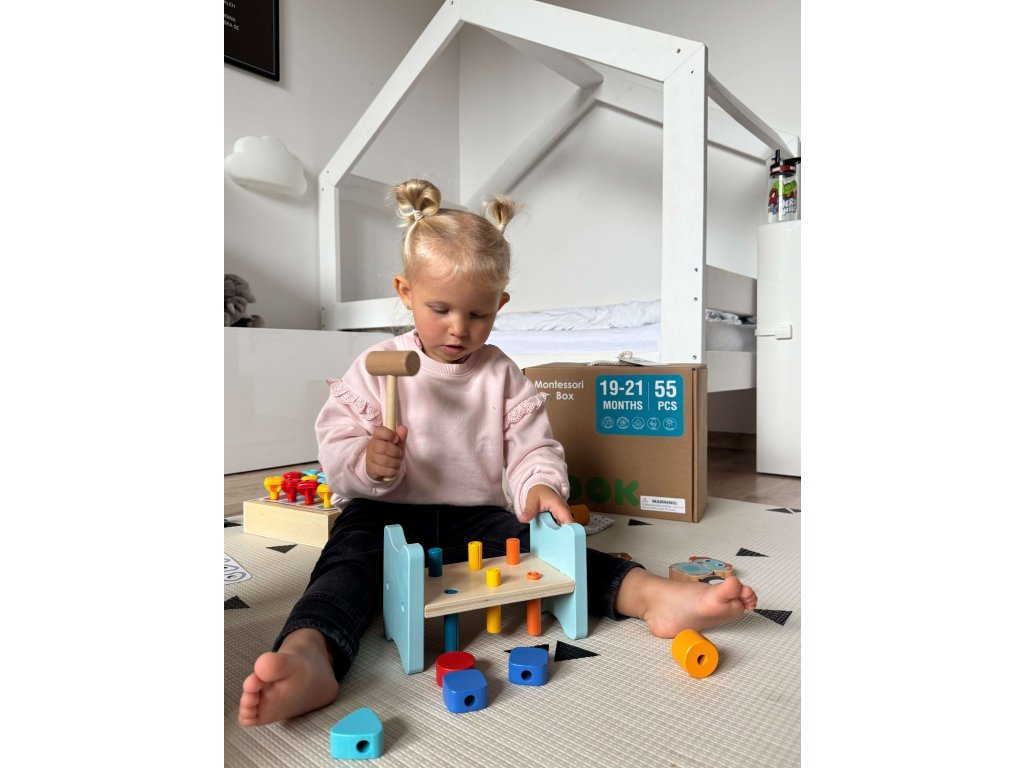 Тази Montessori кутия XXL 5в1 55 части от 19 месеца Моторни Обучителни Чукване Вмъкване е идеалният помощник за развитието на вашето дете на възраст от 19 до 21 месеца, като осигурява забавление и обучение на всяка стъпка от растежа му.