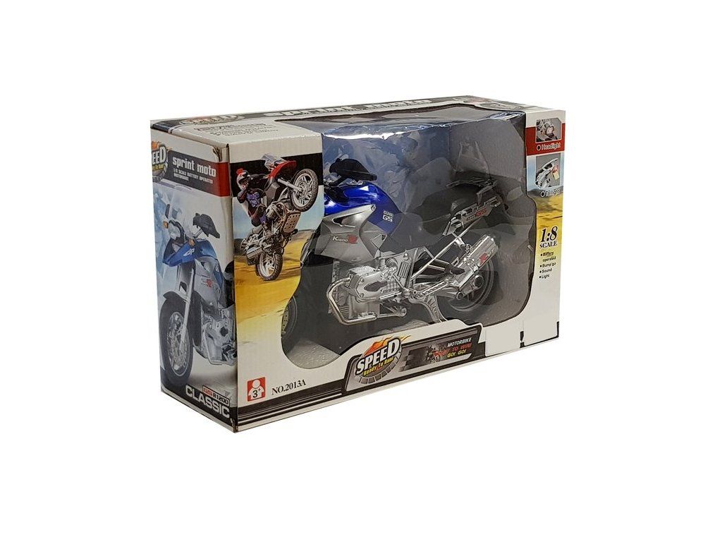 Мотор с аудио ефекти 1:8 синьо е изработен в мащаб 1:8 и разполага със звукови ефекти. Светлинните ефекти са позиционирани отпред и отзад на мотора.