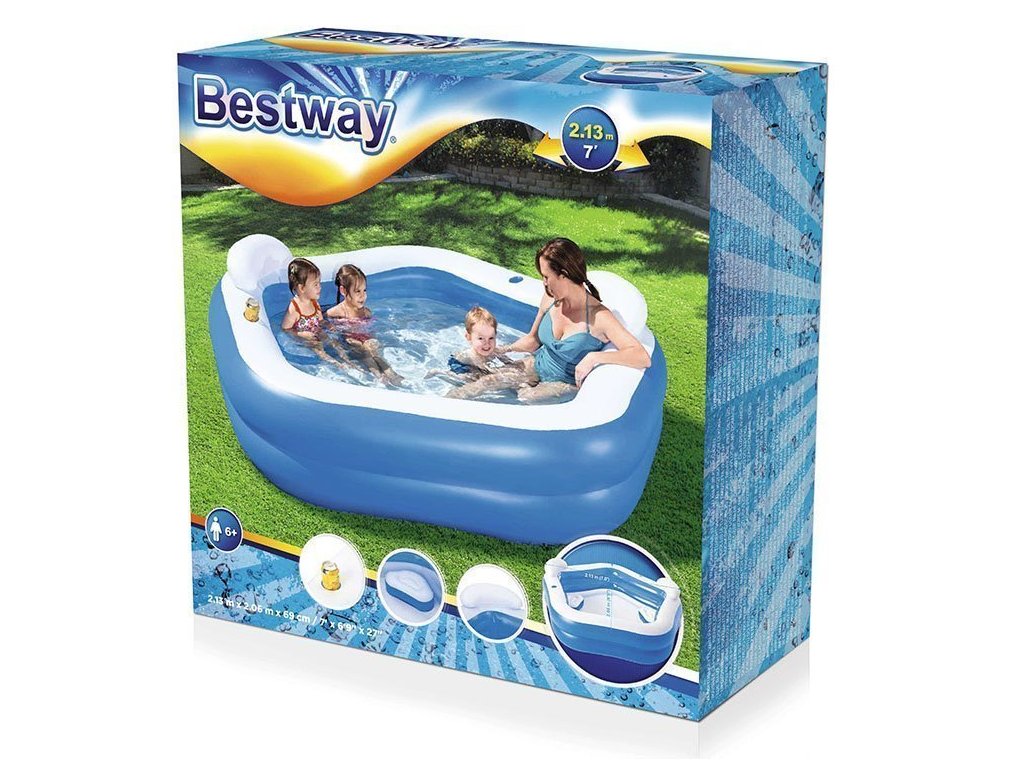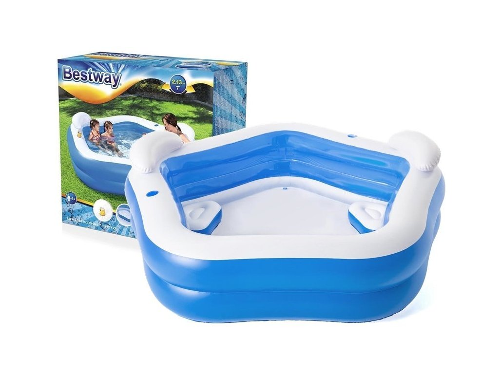 Надуваем басейн Bestway 213 x 206 x 69 см петоъгълник е изработен от висококачествен винил с дебелина 0,27 мм. Басейнът разполага с вградени седалки с облегалки, които осигуряват удобна опора за гърба ви.