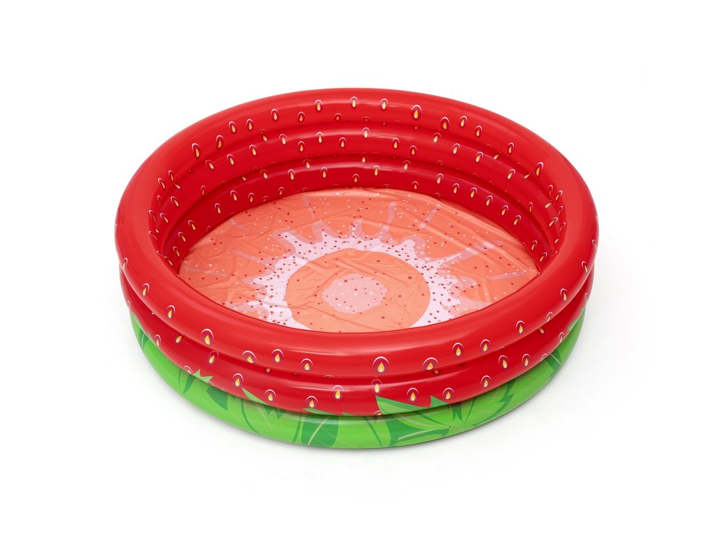 Надуваем басейн с оригинален мотив ягода, който ще осигури забавление и движение във водата на вашето дете. Басейнът е проектиран да насърчава децата да играят и прекарват време на чист въздух. Благодарение на компактните си размери е идеален за деца от 2 години нагоре. Лесен за надуване и изпускане на въздух, което улеснява съхранението. Надуваемите стени осигуряват комфорт и безопасност за най-малките. Изработен е от здрав PVC материал, устойчив на повреди.