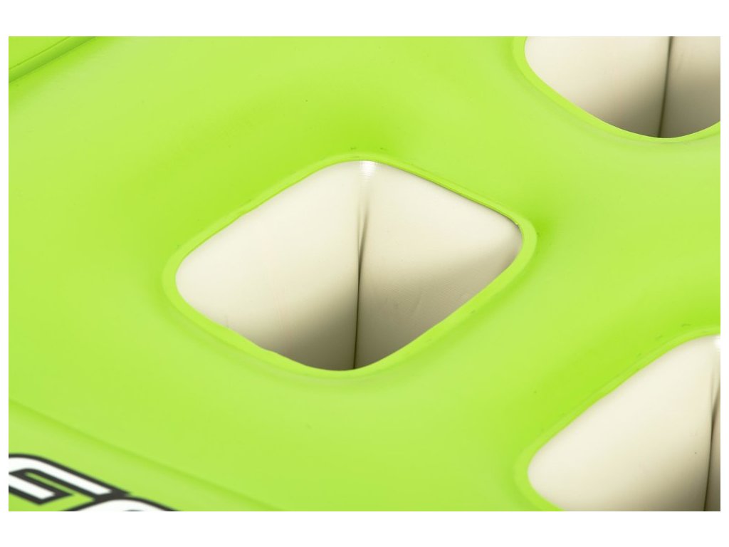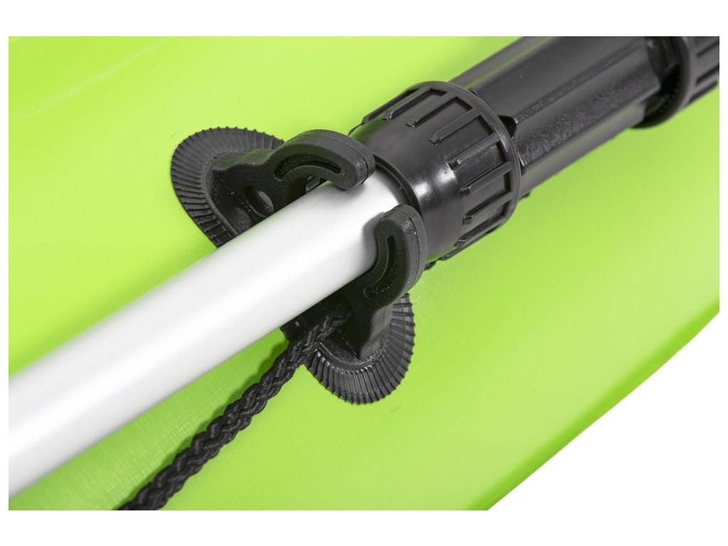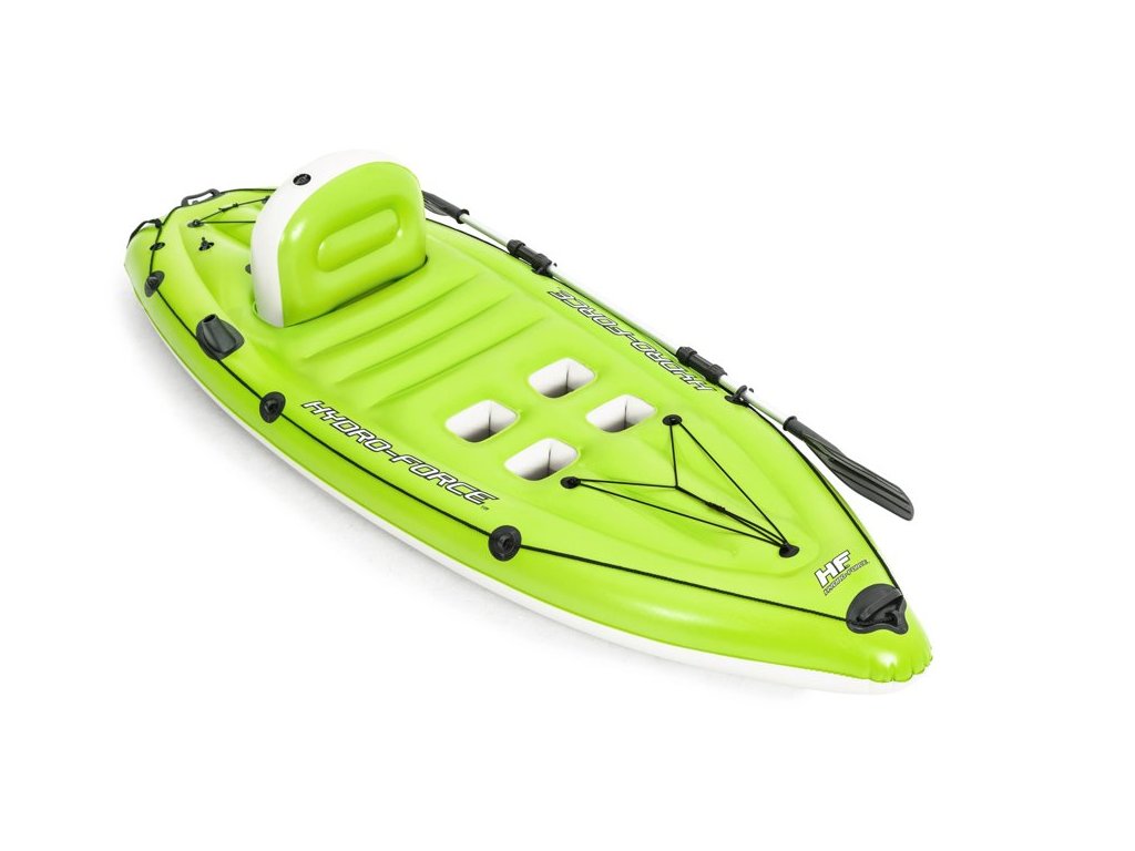 Риболовен каяк разполага с вградени поставки за въдици и закрепващи елементи за гребло. Каякът има и надуваем облегалка за максимален комфорт, както и 4 опори за краката, подходящи за потребители с различен ръст. Подходящ за транспортиране и компактен за съхранение.