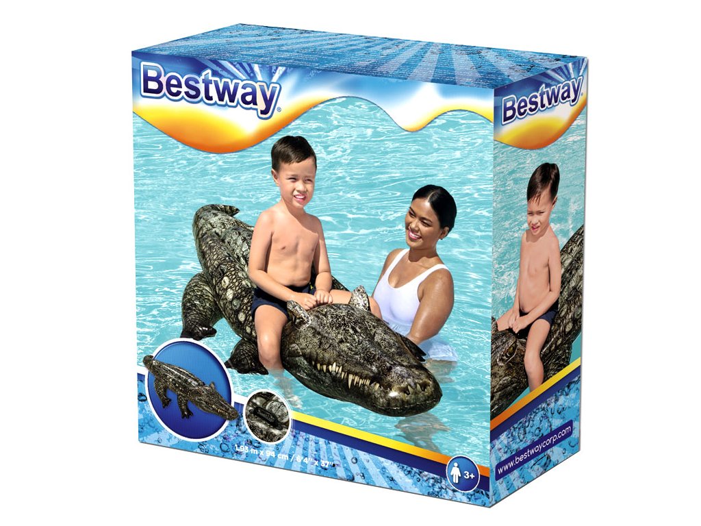 Надуваем крокодил Bestway 193x94см е идеален спътник за водни забавления. Продуктът с размери 193 x 94 см е изработен от висококачествен винил. Максималното допустимо натоварване е 45 кг. Играчката разполага с две въздушни камери и вентили, които предотвратяват изпускането на въздух. Тя е стабилна и безопасна, предназначена за деца над 3 години. На гърба има удобна дръжка, за която детето Ви може да се хване. В комплекта е включена ремонтна лепенка.