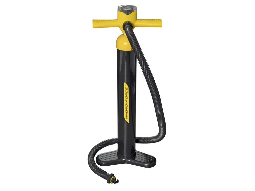 Падълборд Bestway разполага с удобен седалка с облегалка. Комплектът включва здраво гребло, ръчна помпа, въже за осигуряване, раница, перка и комплект за ремонт.