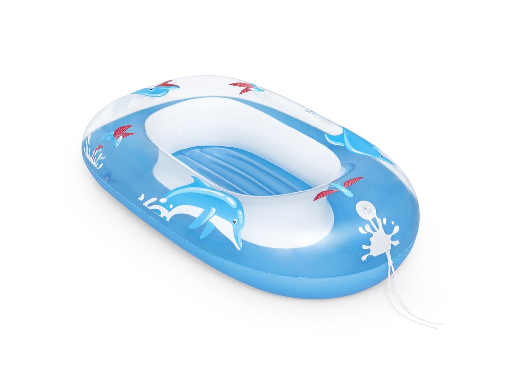 Ако вашето дете обича да прекарва време във вода или тепърва се учи как да се забавлява, осигурете му надуваема лодка за плуване. Лодката е лека и се пренася лесно след сгъване, благодарение на компактните си размери. Цветната графика с делфин ще вдъхнови детето за още по-забавни игри във водата. Подходяща е за деца на възраст от 3 до 6 години. Допълнително удобство предоставя меката облегалка и надуваемото дъно, осигуряващи комфорт по време на игра. Изработена е от издръжлив винил, устойчив на повреди.