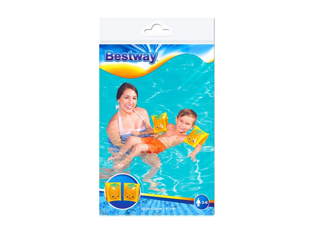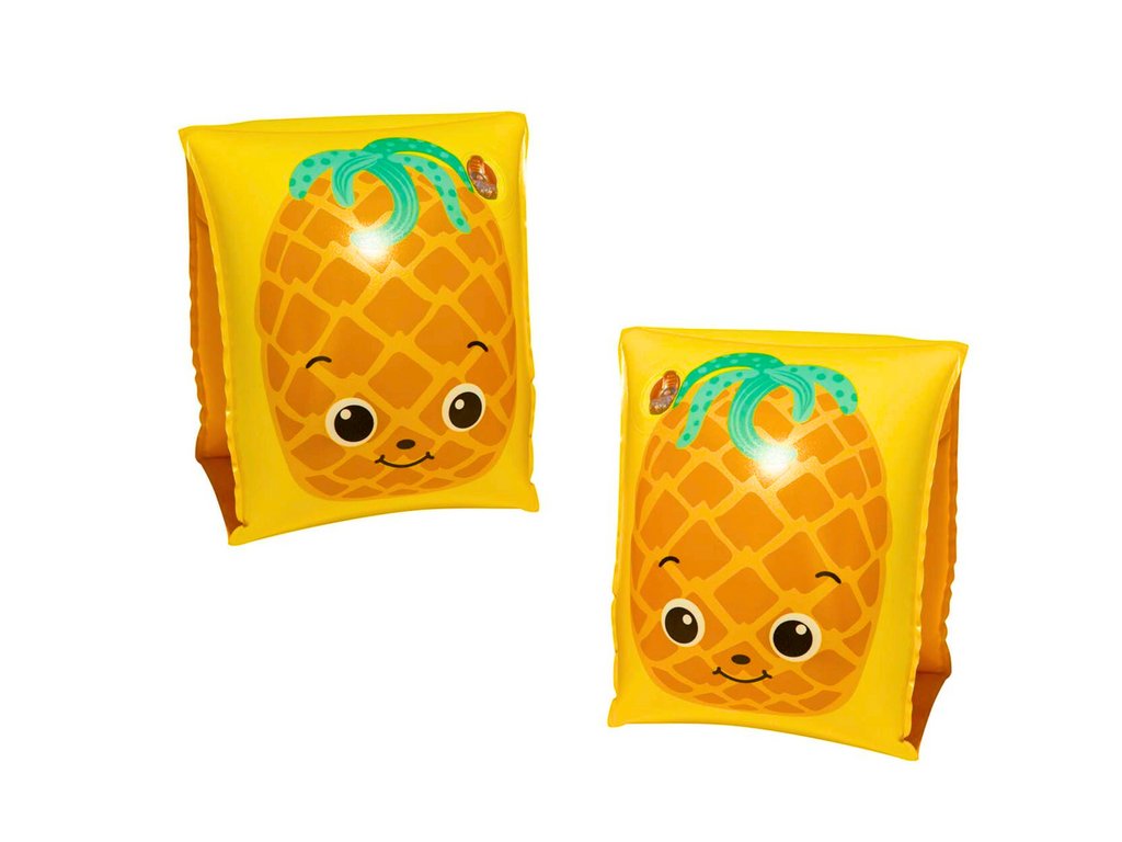 Надуваеми ръкавици за плуване Bestway ананас с весела щампа на ананаси ще помогнат на децата да преодолеят първата си несигурност при игрите във вода. Благодарение на яркия им дизайн, те мотивират децата към активност и игра, като същевременно осигуряват безопасност при плуване. Изработени от здрав и издръжлив материал, тези ръкавици се надуват лесно и след сгъване са компактни, което ги прави идеален спътник за всяко водно приключение.