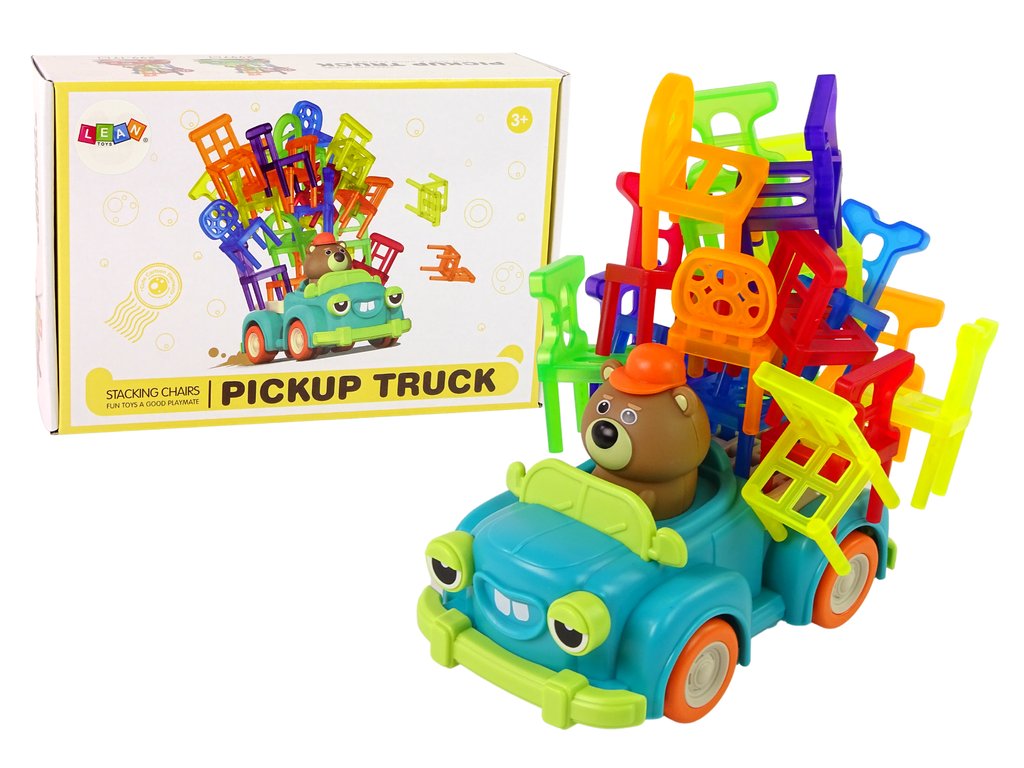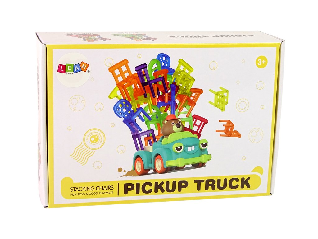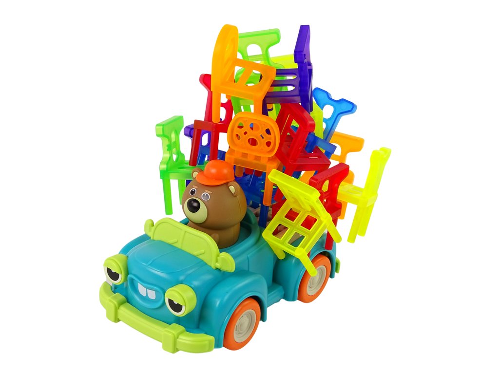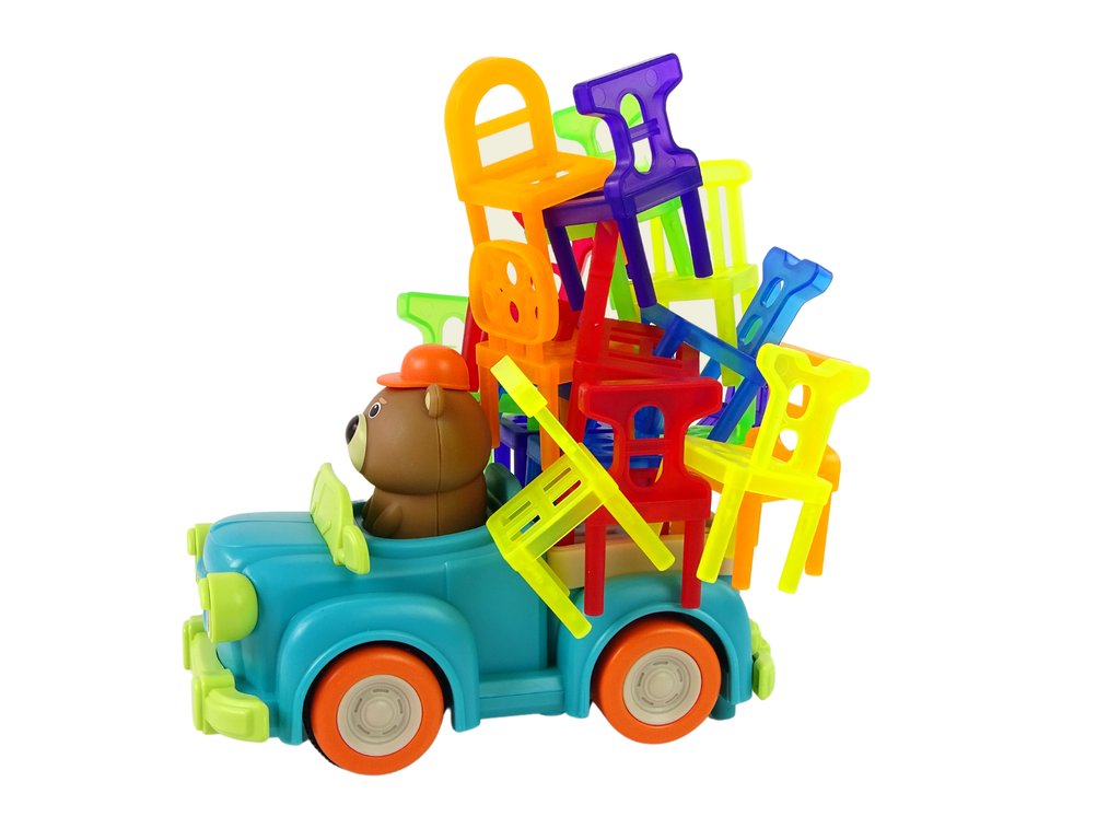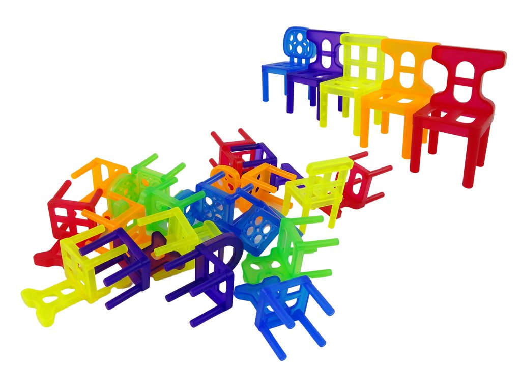Забавна настолна игра с падащи столовесъдържа 48 стола с различни форми и цветове и батерийно количка. Количката се движи, кара се в кръг, а целта е да се построи кула от столове. Правилата са много прости. Всеки играч на свой ход поставя един стол върху друг, така че изградената кула да не се срути.