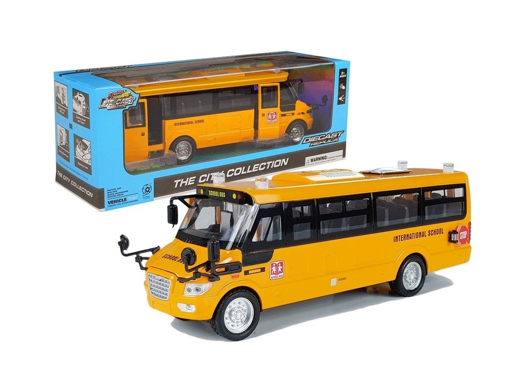 Навиваща се количка училищен автобус жълт разполага с подвижни части, като отварящи се врати отстрани и отзад. Автобусът има отварящ се преден капак. Моделът е оборудван с осветление и говорител, който издава звук на работещ двигател. Количката разполага с навиващ механизъм.