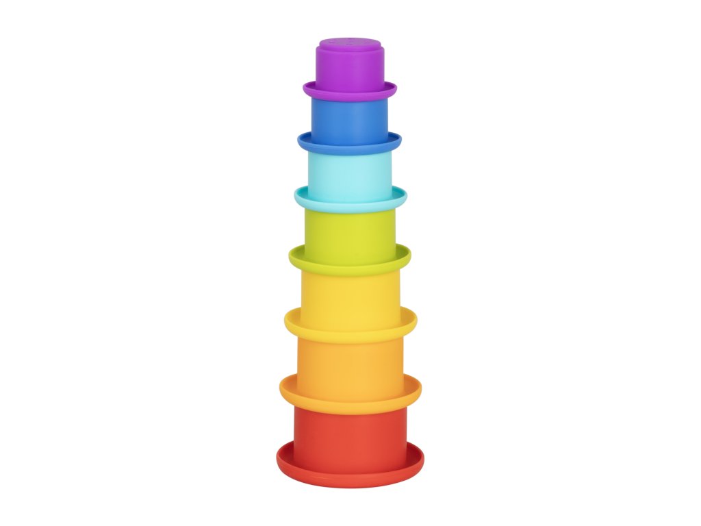 - Комплект цветни чашки, които децата могат да подреждат една върху друга или една в друга.