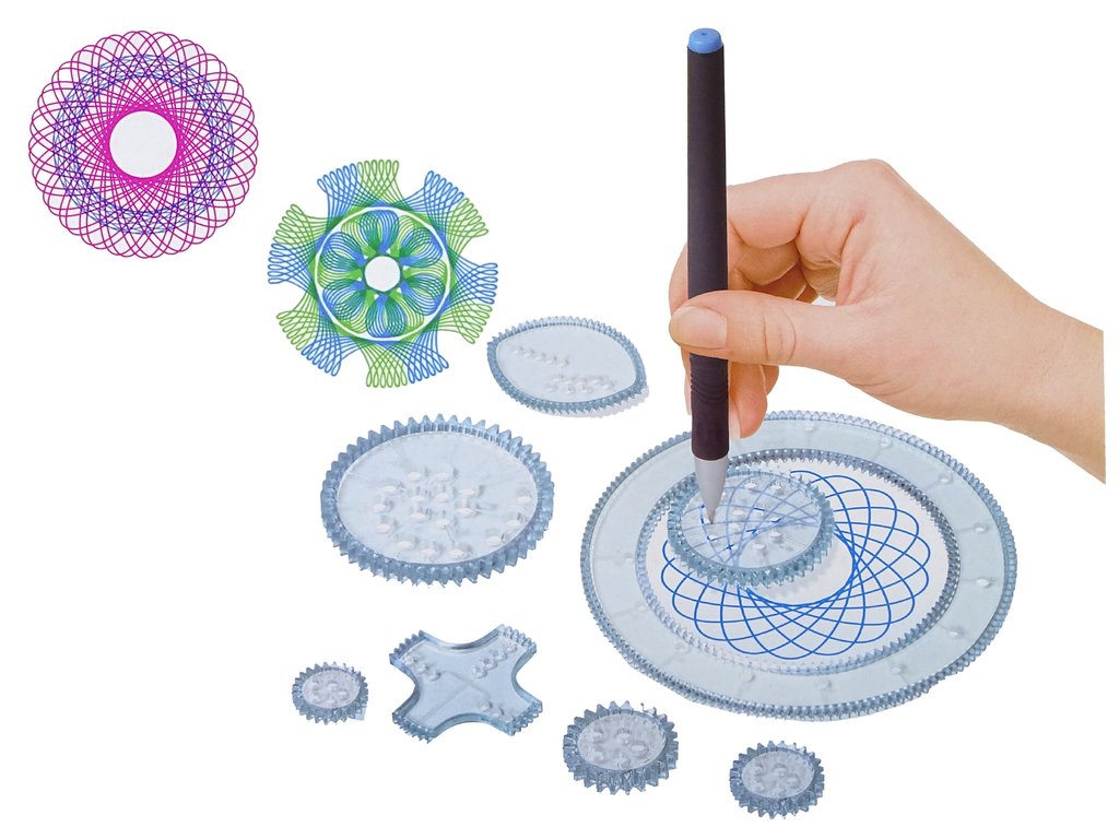 Най-важната част от тази играчка са пластмасовите шаблони. Многообразието им по размер и форма дава безброй възможности за експериментиране и създаване на уникални произведения.