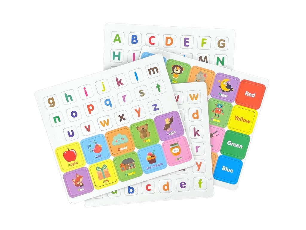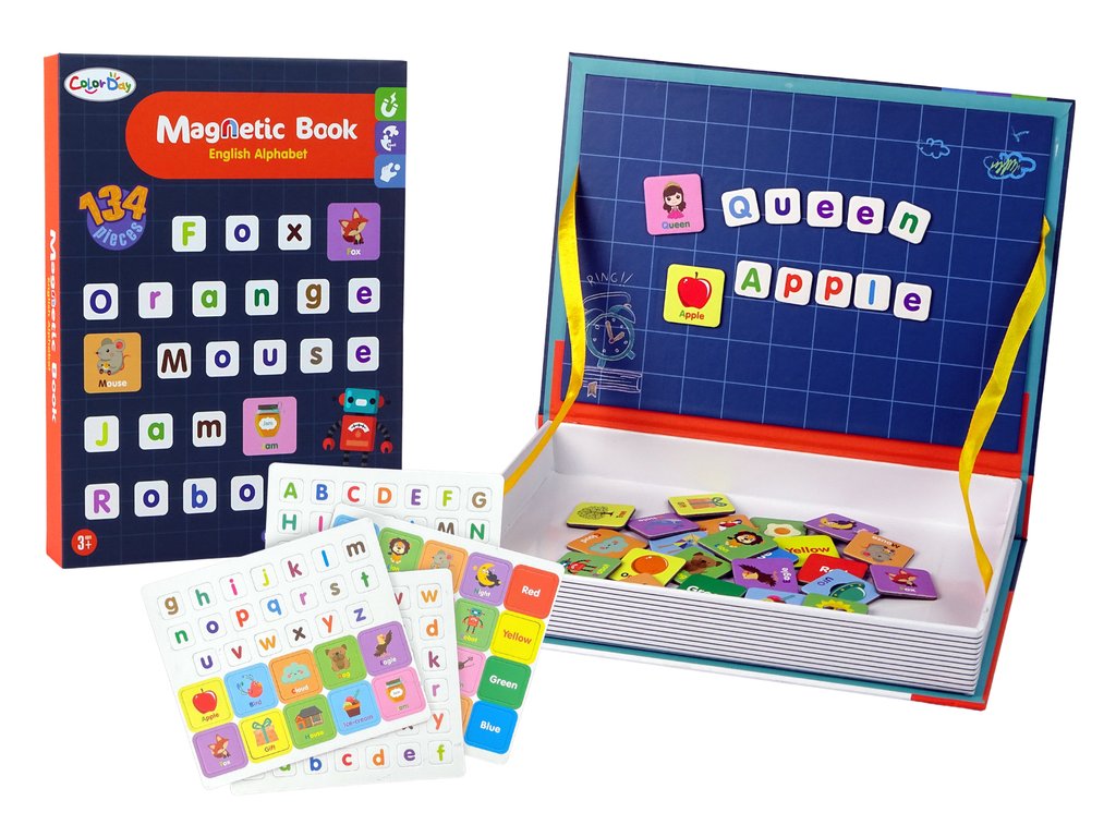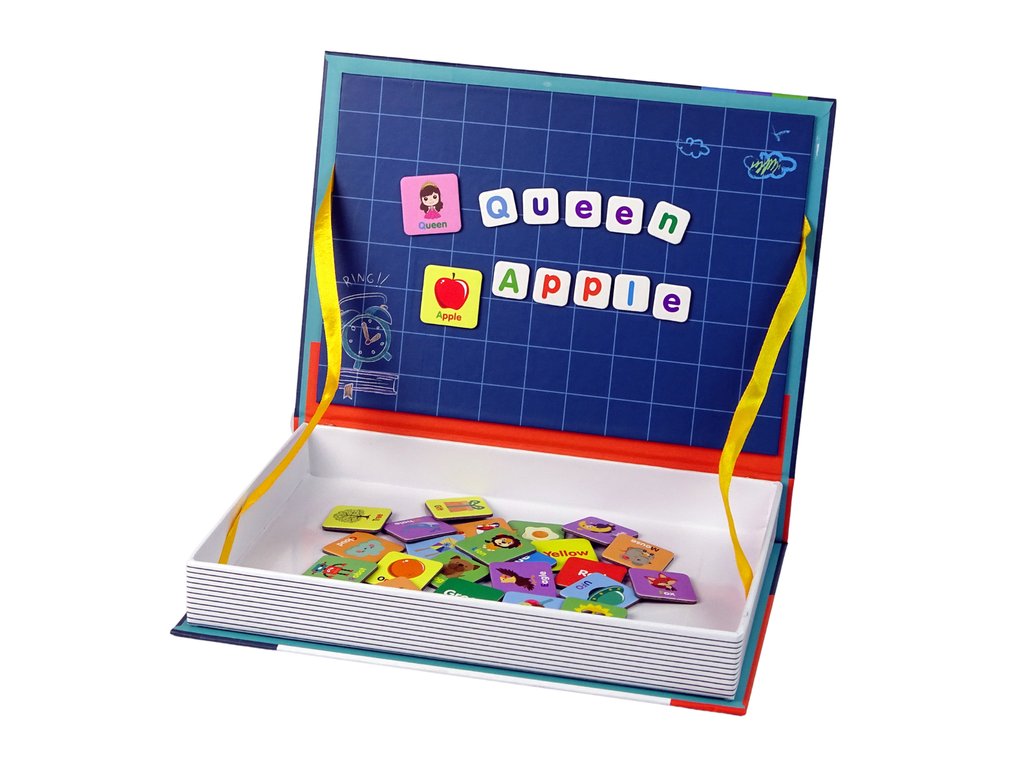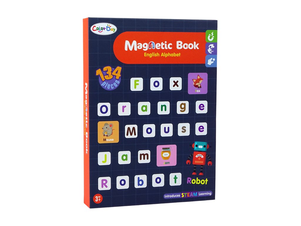 Частите на пъзела включват 134 магнита с букви, картинки и цветове с английски думи. Опаковката е здрава, под формата на книга, а вътре в нея има магнитна дъска.