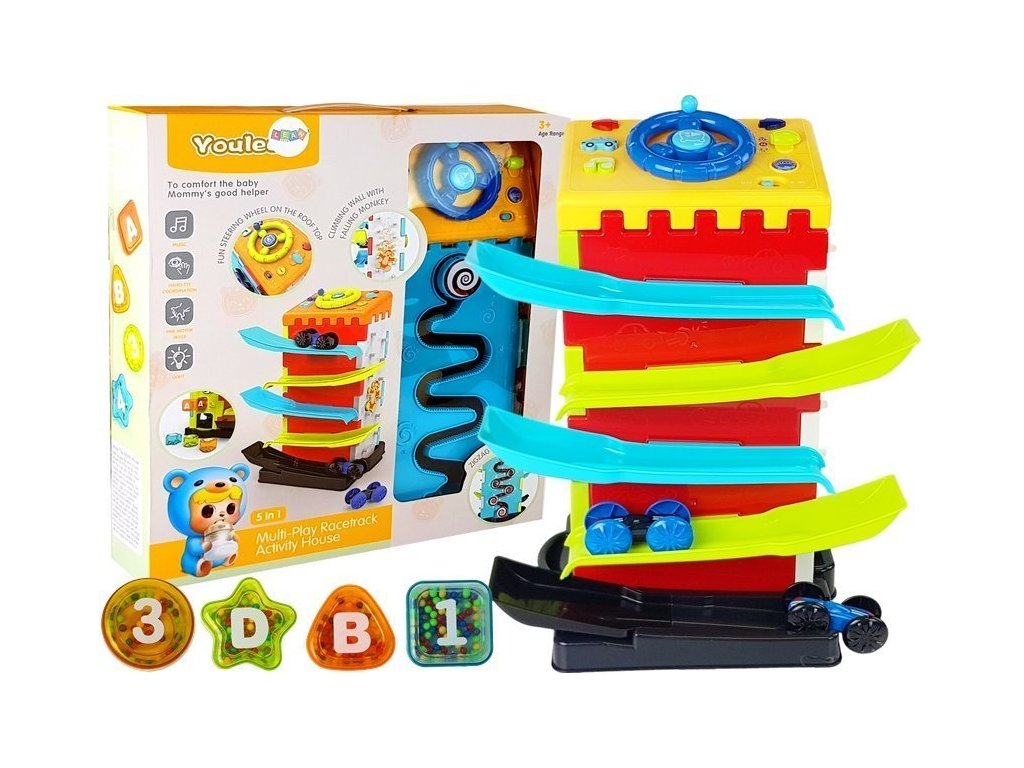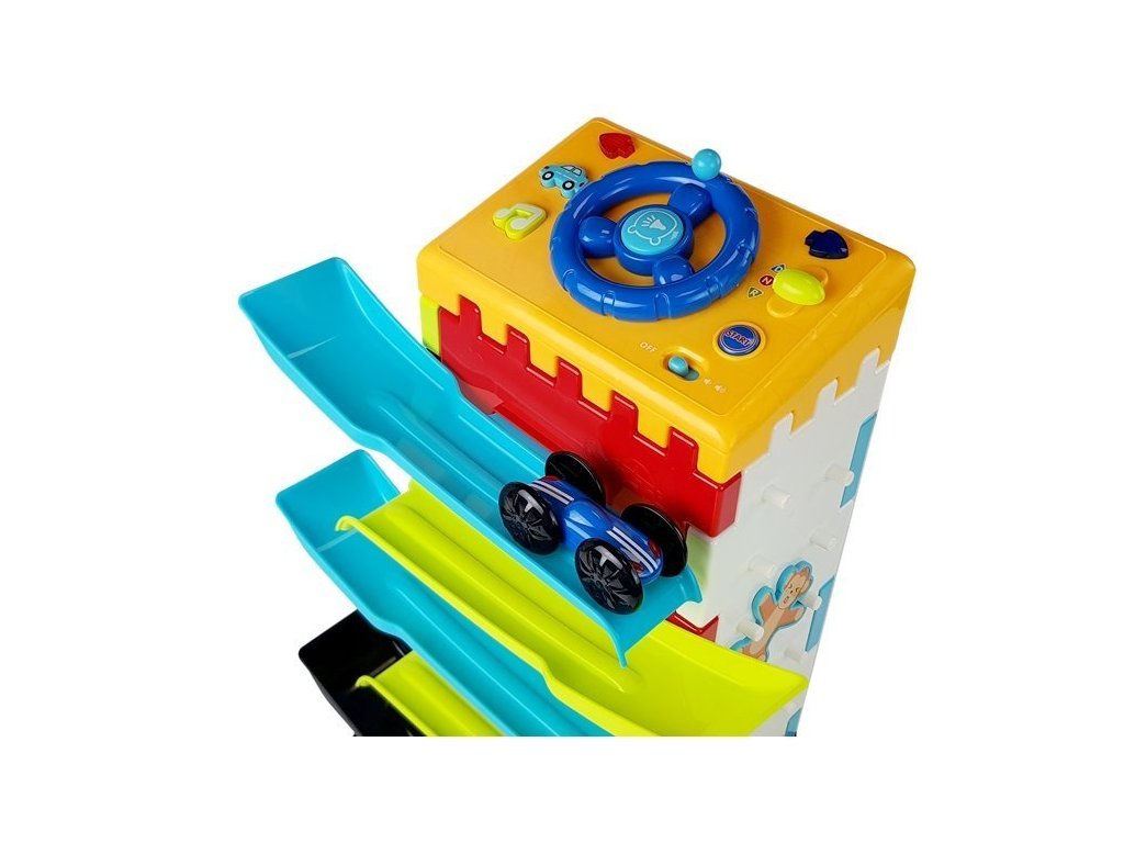 2. Управление на волана на покрива, с допълнителни звукови ефекти, които развиват слуха и подпомагат свързването на звуци с предмети. При завъртане на волана светват стрелки, а също така има гласови инструкции на английски език. При натискане на стартовия бутон се чува звук на изстрелване и клаксон. Лостът за превключване има две позиции: движение напред и назад. Всички функции са съчетани със светлинни и звукови ефекти. Детето не само учи нови неща, но се чувства сякаш е зад волана на истинска кола.