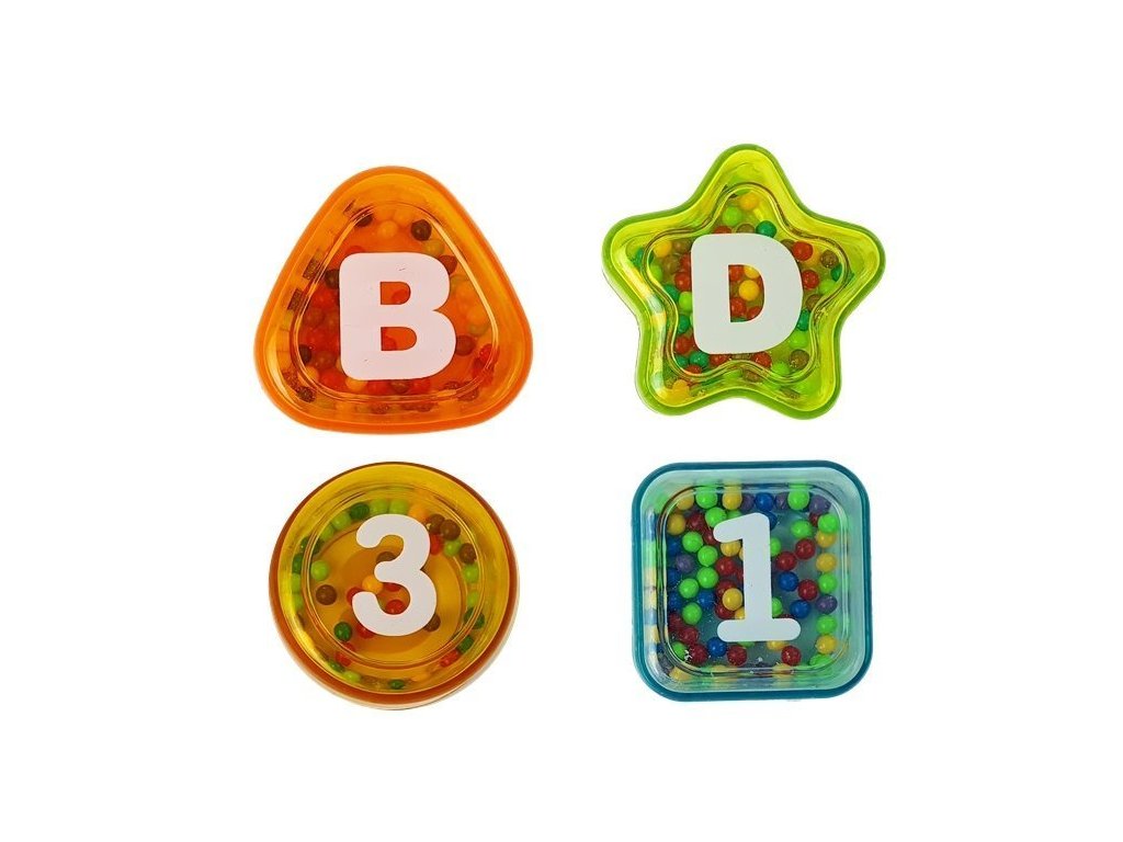 3. Подреждане на форми (триъгълник, квадрат, кръг, звезда с топчета в средата, които също служат като дрънкалка).
