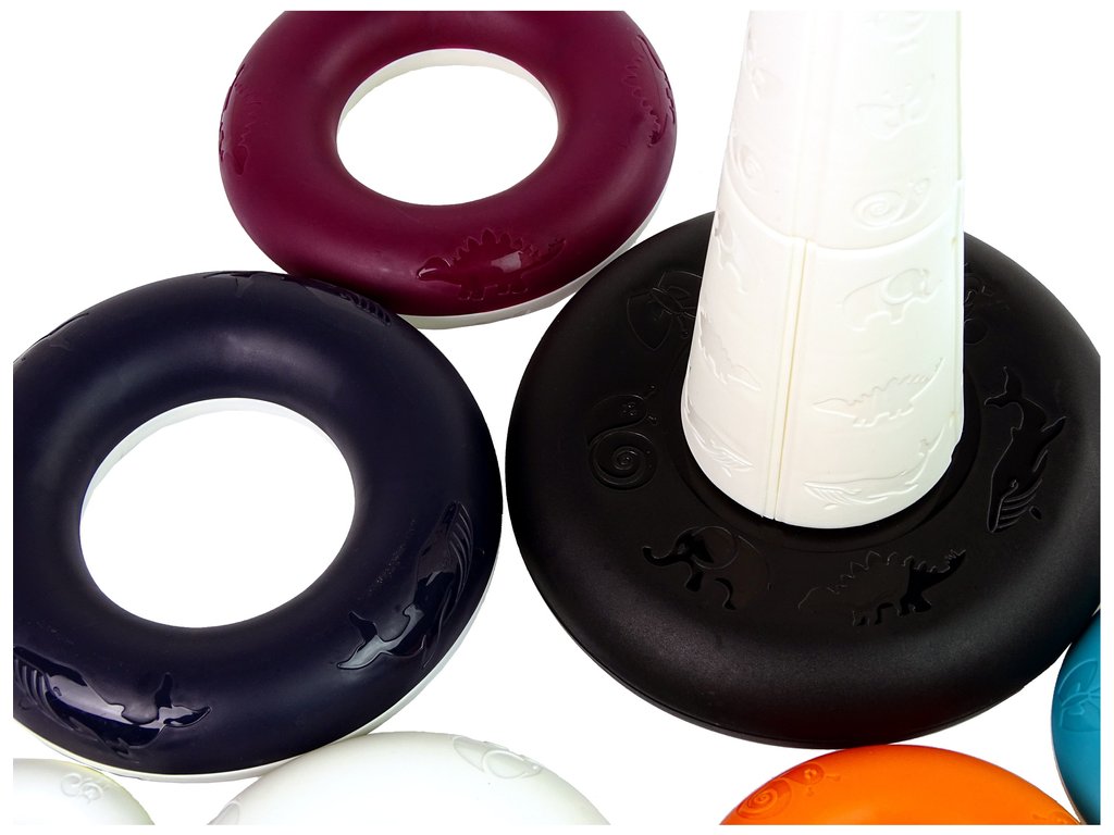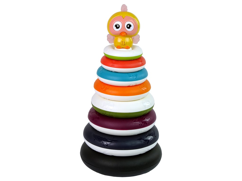 - Комплектът съдържа няколко вида обръчи с различни размери. Една от възможностите е да подредите обръчите според детската фантазия. Жълтата патенце на върха на пирамидата прави играта по-забавна с характерното си дрънчене. Крилцата ѝ са изработени от мека гума, която може да се ползва като гризалка. Цветният дизайн с животни помага на вашето дете да се развива и да опознава света около себе си. На пирамидата има и изображения на животни, съответстващи на отделните обръчи. Мъникът може да създава картини, докато строи кулата.