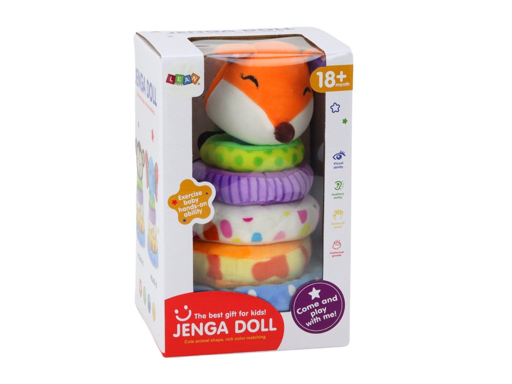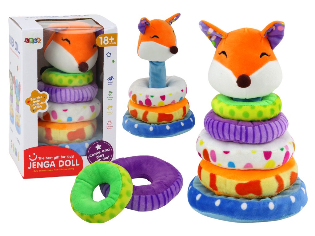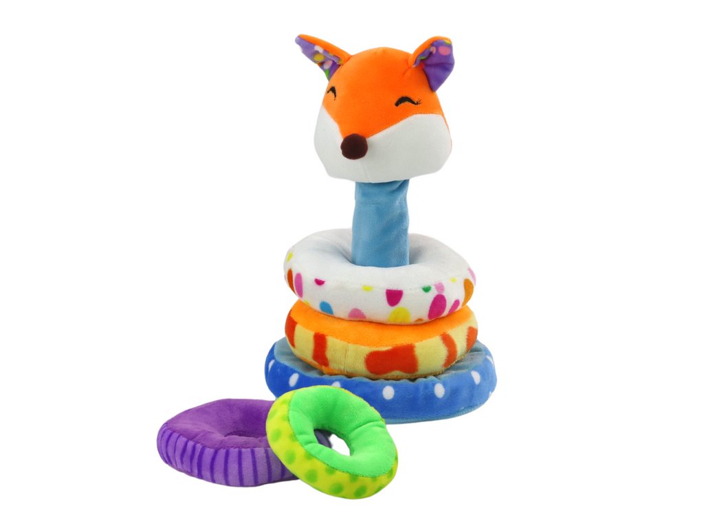 На върха на пирамидата е поставена плюшена лисичка, която придава приятелски и игрив акцент на играчката. Тази безопасна и приятна играчка е идеална за развитие на сензорните и когнитивните способности на децата от 18 месеца.