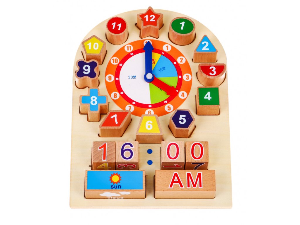 Образователни дървени часовници с кубчета с въртящи се стрелки, които могат да се настройват свободно, за да се учи показването на часа. Кубчетата с цифри позволяват на децата да записват времето веднага. Дървените блокове са с картинки, показващи време и част от деня.
