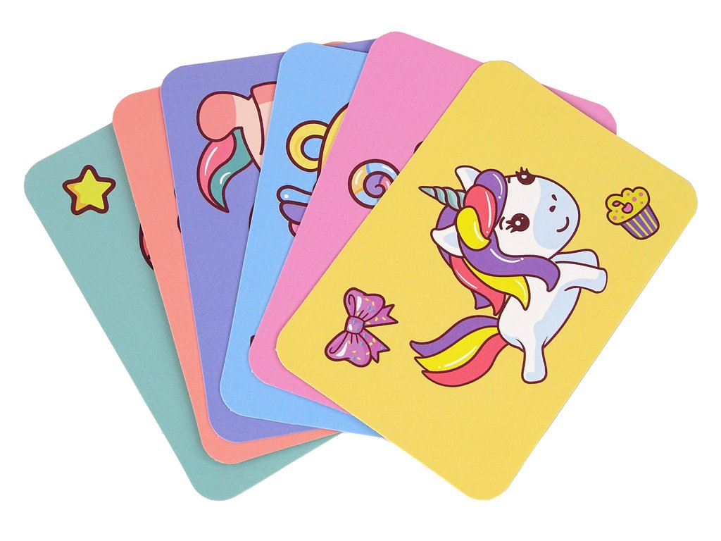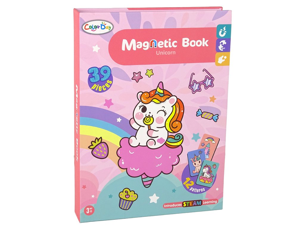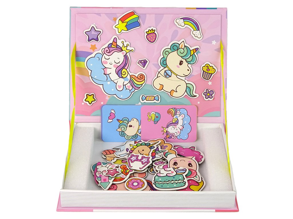 Комплектът включва карти с изображения на сладки еднорози. Задачата на детето е да подреди магнитните елементи според модела, така че да пресъздаде напълно дадената картинка.