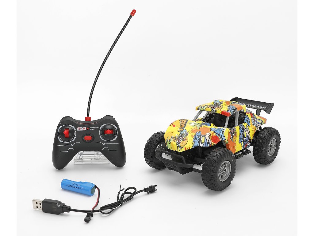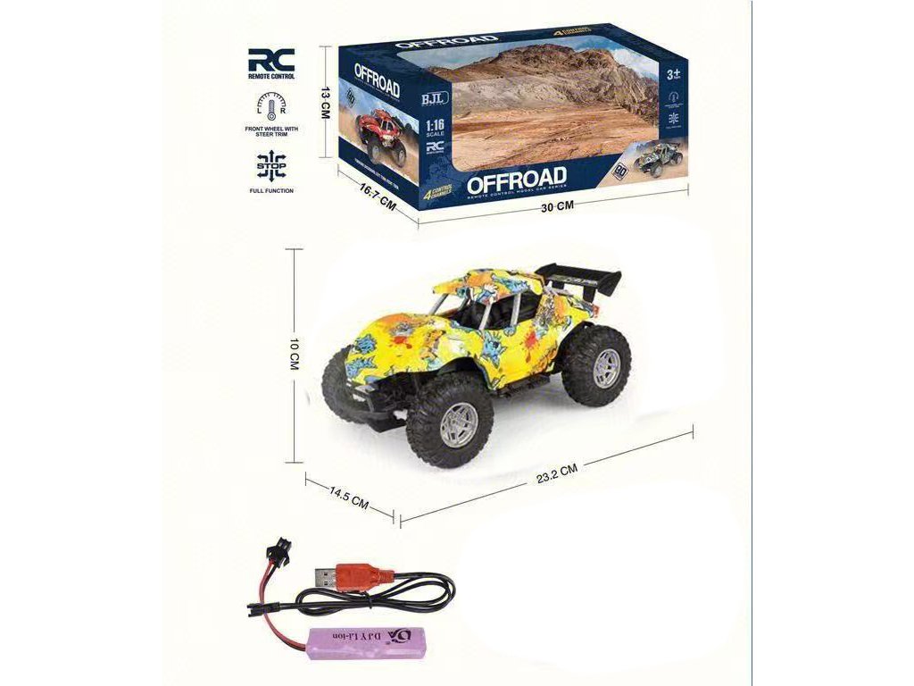 Цветното RC бъги в мащаб 1:16 е идеална играчка за всички малки шофьори, които обичат бързото каране и приключенията извън пътя. Благодарение на големите гуми и здравата конструкция, то може да се справи и с неравни повърхности и предлага много забавление у дома и навън.