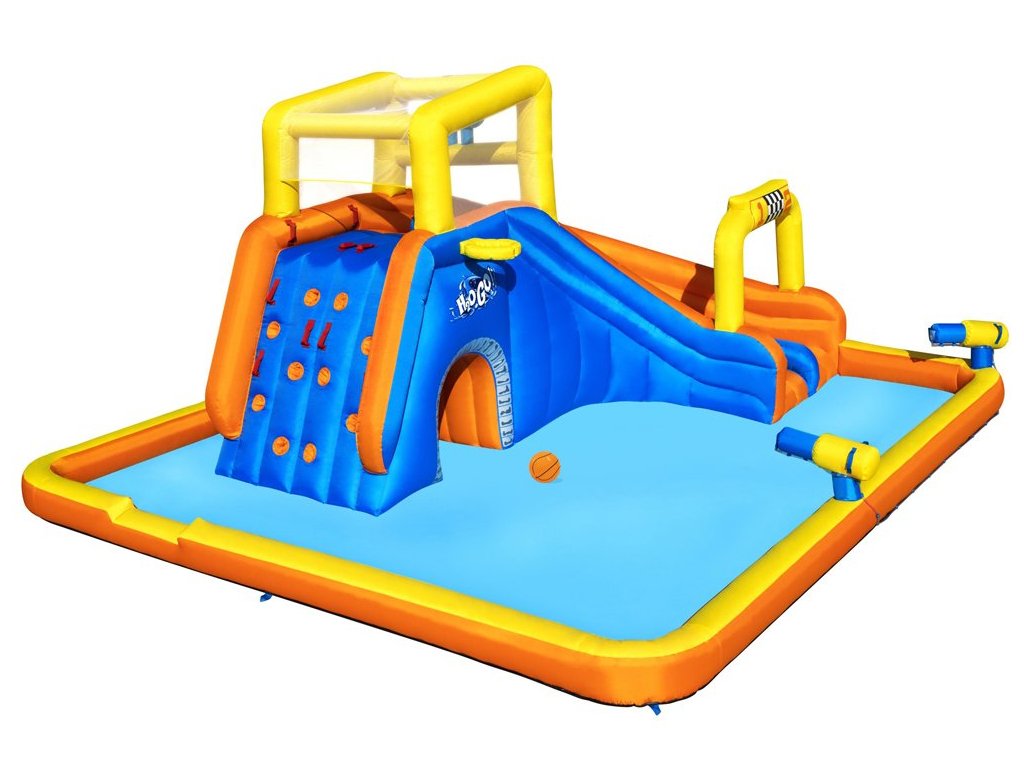 Огромен надуваем воден кът Bestway 551x502x265 см предлага часове забавление в двора. Всяко дете обича да играе във водата, а с този надуваем аквапарк на Bestway можете да създадете собствен мини воден свят в градината си. Този надуваем воден комплекс се сглобява само за 2 минути! Нужно е само равен участък от двора и забавлението може да започне. Децата ще се радват на многото атракции, които имат пред дома си – могат да организират състезания и игри с приятели, да се пръскат във водата, да лазят и пързалят, да играят баскетбол и да стрелят с водни оръдия, наслаждавайки се на игри през цялото лято.