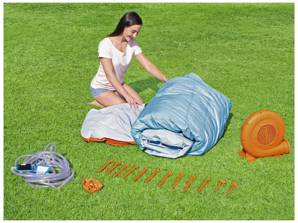С включената помпа, надуваемият парк се сглобява лесно и бързо, без сложни процедури.