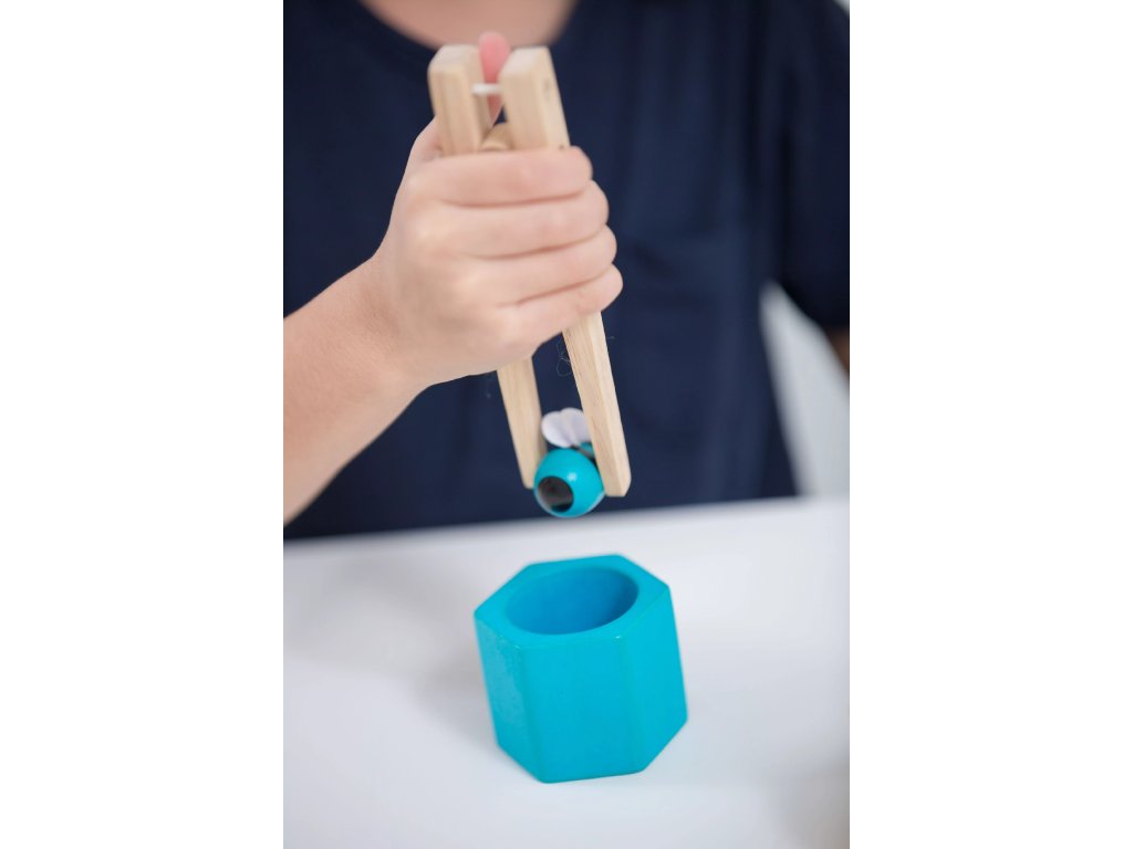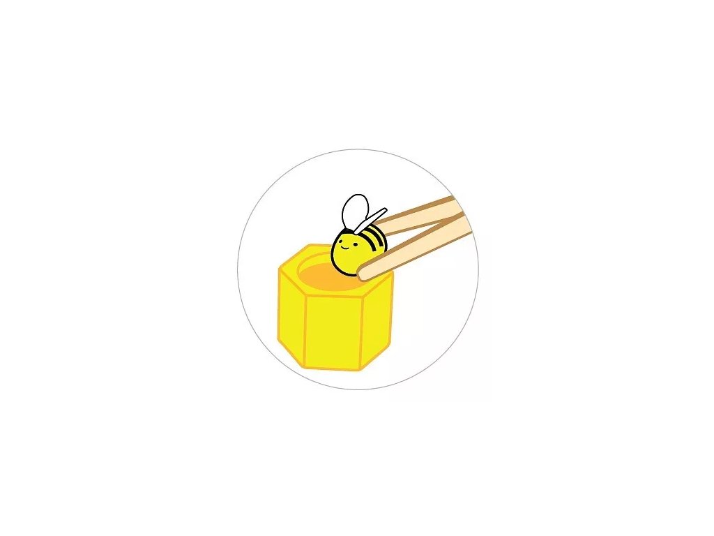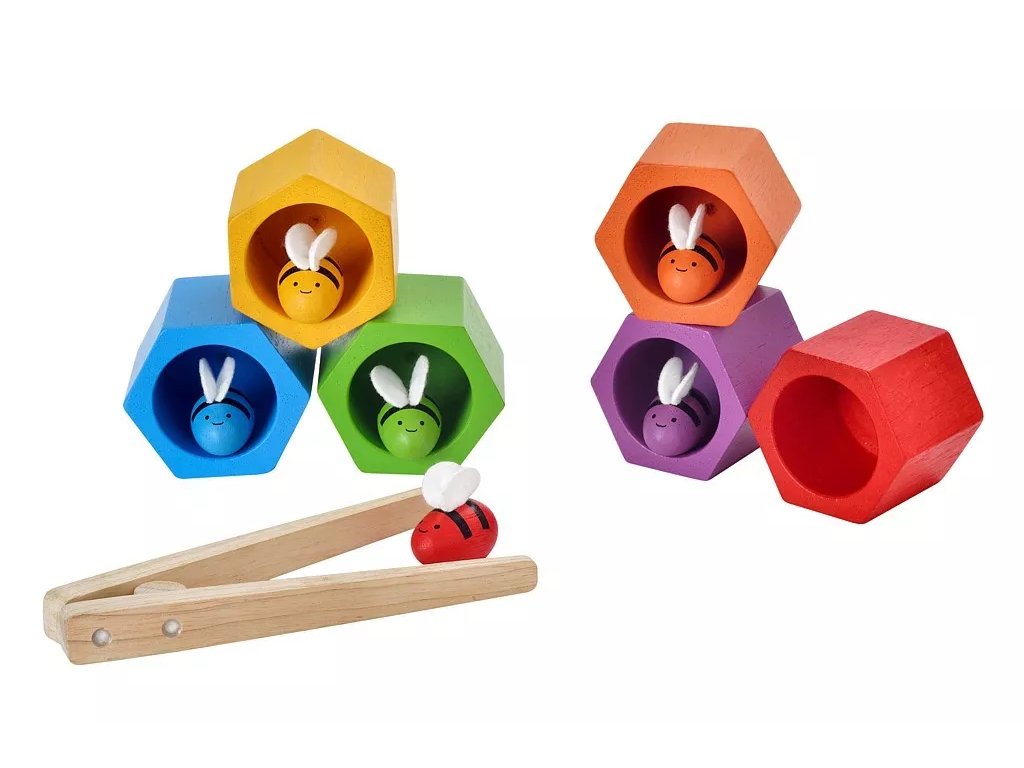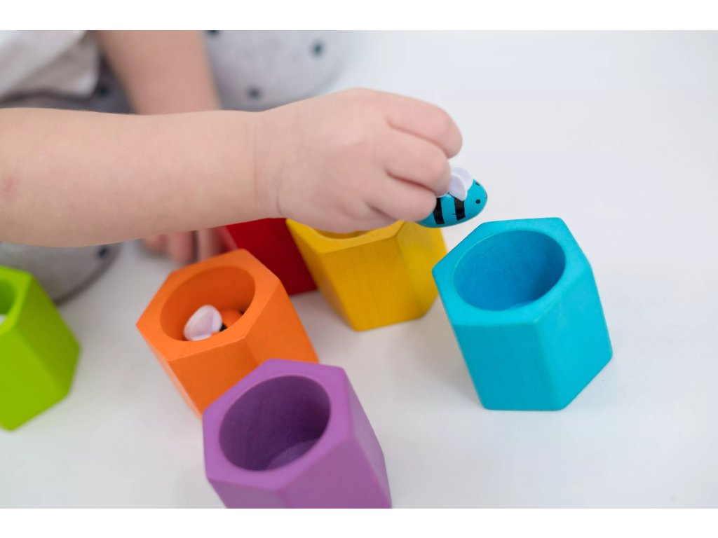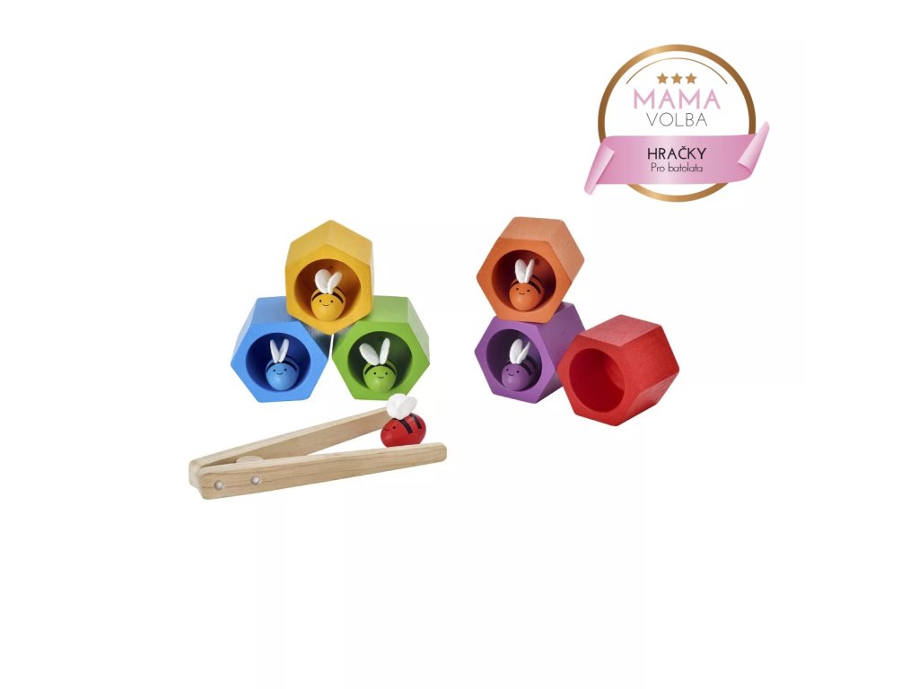 Дървен образователен комплект, предназначен за развитие на фината моторика, разпознаването на цветовете и основните умения за смятане. Децата поставят малки пчели в съответните кошери с помощта на пинсети, като по този начин тренират координация и търпение.