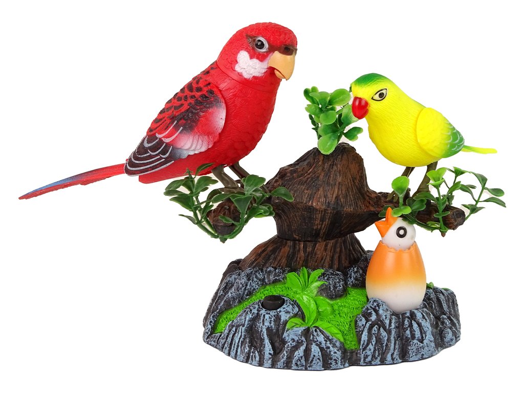 Тази очарователна и интерактивна играчка пренася децата в света на природата. В комплекта ще откриете два папагала (червен и жълт), които са на клон на дърво, както и малък папагал, лежащ под тях. Птичките на клоните издават различни звуци и се движат, а малкият папагал свети с цветна светлина. За да активирате играчката, просто натиснете черния бутон.