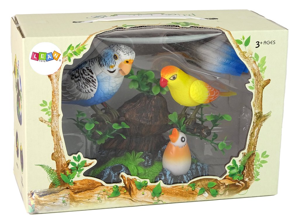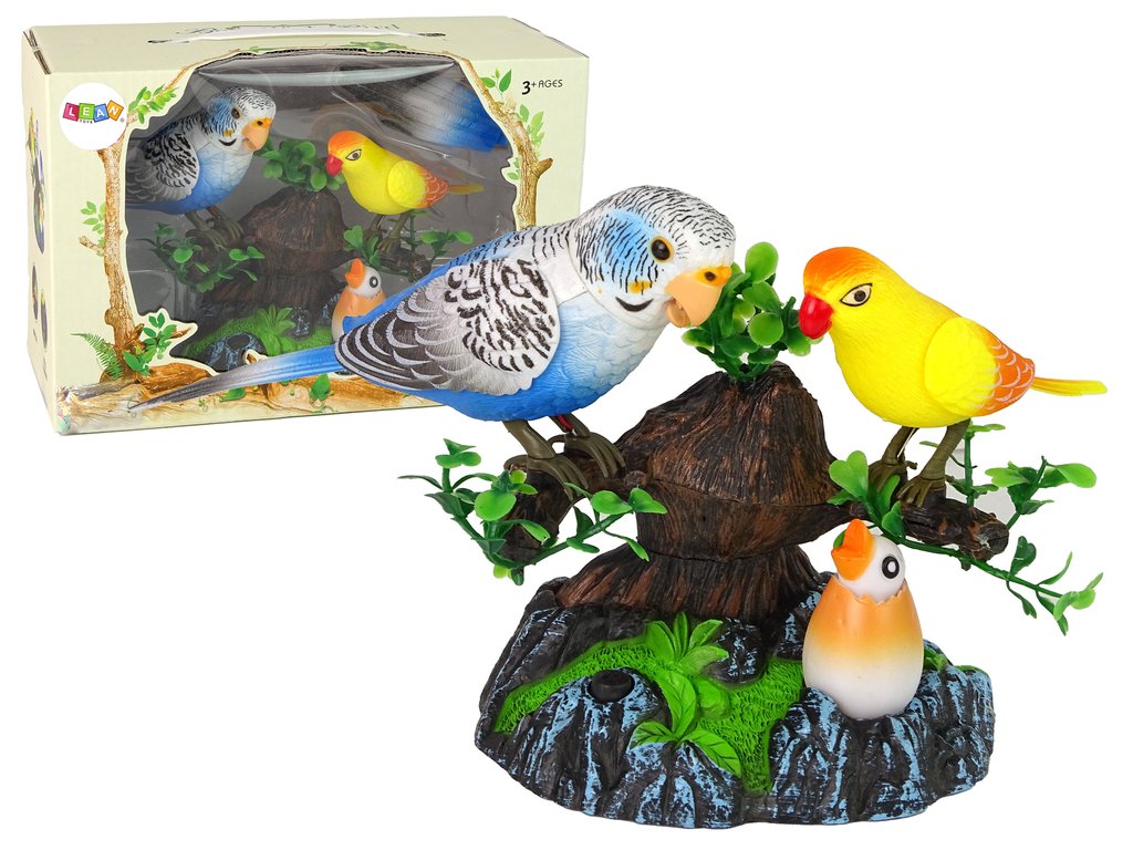 Тази очарователна и интерактивна играчка пренася децата в света на природата. В комплекта са включени два папагала (син и жълт), поставени на клон на дърво, както и малко папагалче, лежащо под него. Птичките на клона издават различни звуци и се движат, а малкият папагал свети с цветна светлина. За да активирате играчката, просто натиснете черния бутон.