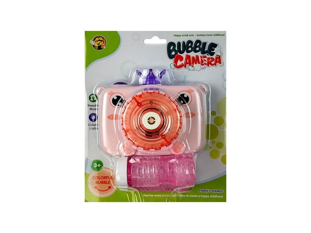Пенещ се фотоапарат розов, който създава сапунени балончета. Перфектен подарък за забавление през топлите дни. Допълнително предимство на фотоапарата са светлинните и звукови ефекти. Просто налейте течност, натиснете бутон и от фотоапарата излизат множество сапунени балончета. Доставя се с ремък, за да можете удобно да го носите на врата като истински фотоапарат.