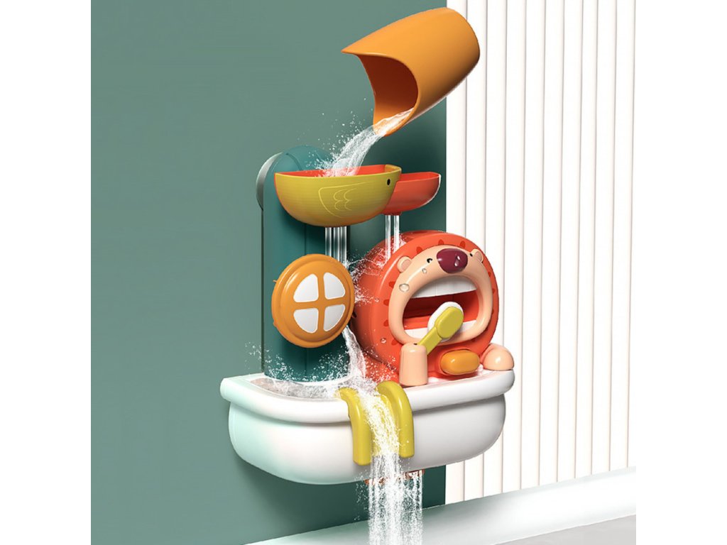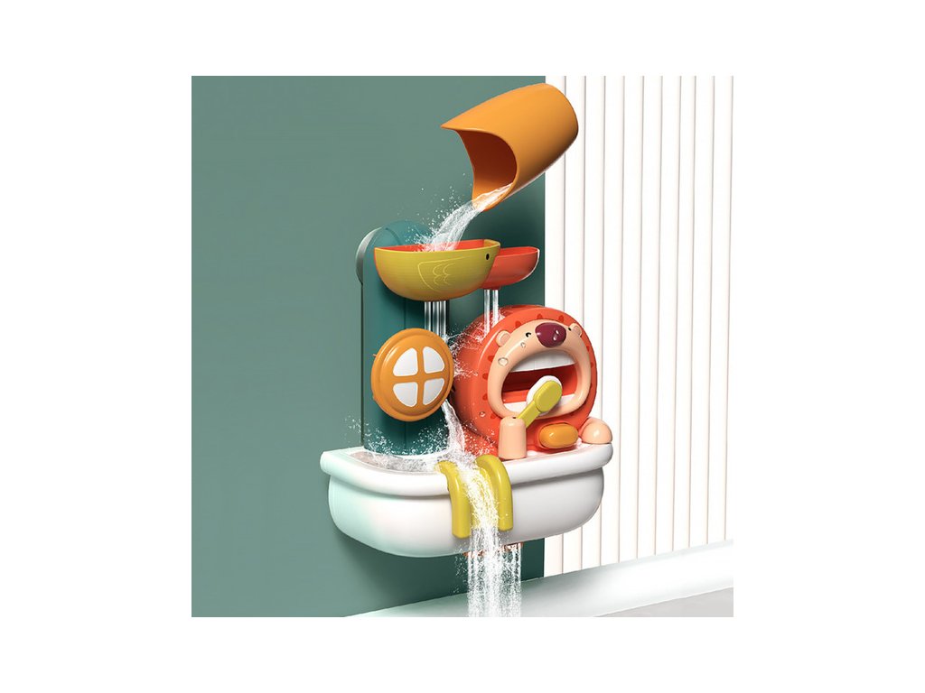 Играчката има контейнер за сапун, ръчен бутон, който задвижва четката за зъби, която създава пяна, и главата на патица, през която налятата вода движи дисковете и пързалката. Благодарение на четирите вендузи можете лесно да прикрепите играчката към ваната или плочките, а здравата конструкция и цветният дизайн ще привлекат вниманието на вашето дете.