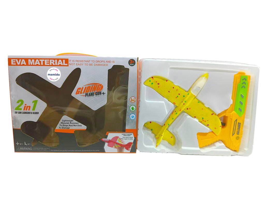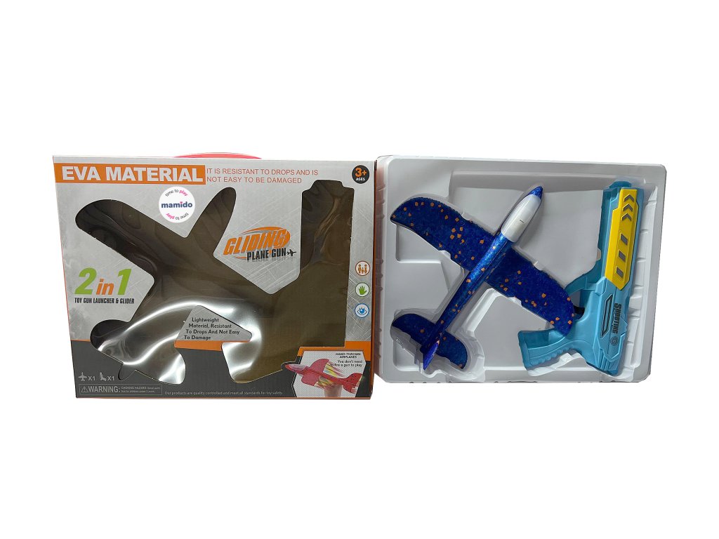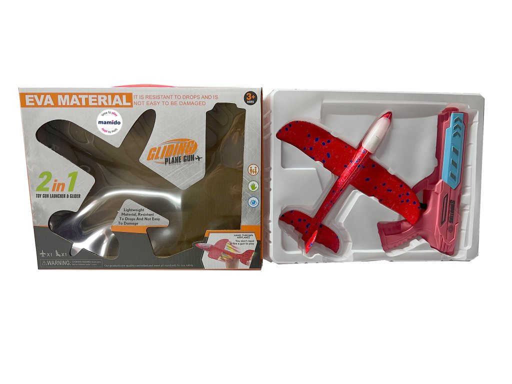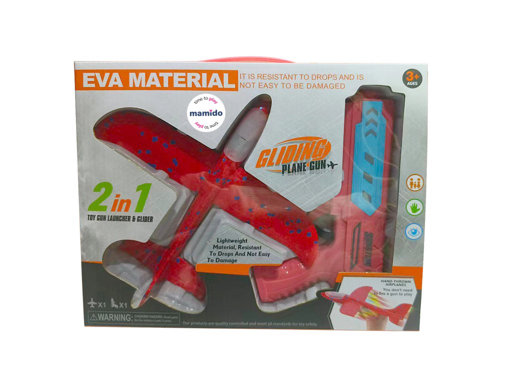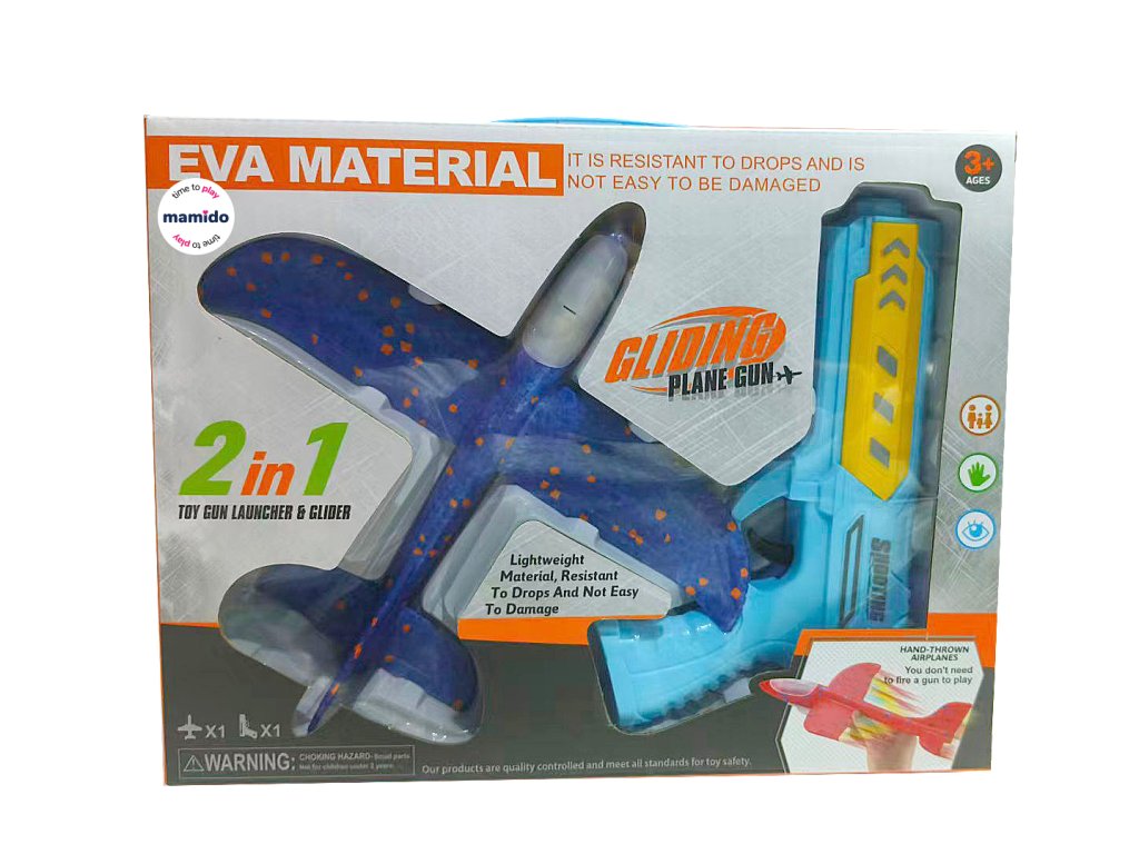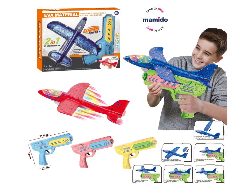 Изживейте страхотно забавление с оригиналния пистолет 2в1 и летящ планер! Просто поставете самолета от издръжлива EVA пяна върху пистолета, дръпнете и стреляйте – самолетът ще излети и ще се плъзне във въздуха. Благодарение на лекия материал, той е безопасен и устойчив на удари, така че ще издържи и на по-диви игри. Някои модели имат и цветна LED светлина, която ще добави още по-голям ефект към старта.