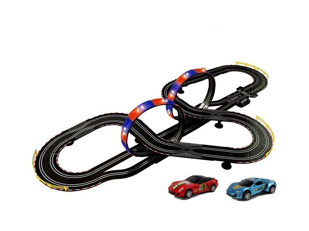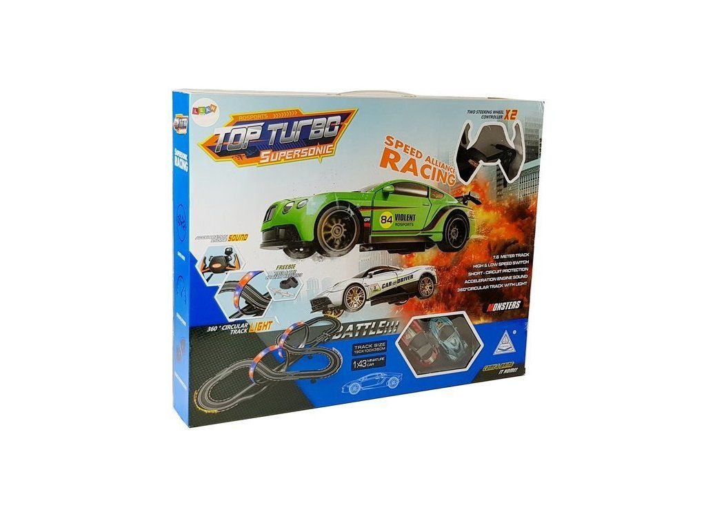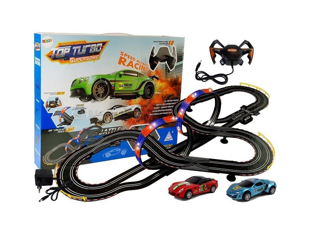 Представяме ви гигантска писта за коли с 360-градусови завои. Карането е допълнено с многоцветни светодиоди. Писта за коли Гигант 1:43 със звук и светлини 7,6м позволява едновременна игра с двете колички. Количките са в син и червен цвят, мащаб 1:43. Всички функции на пистата се управляват с дистанционно управление, включително звукови ефекти и скорост на количките.