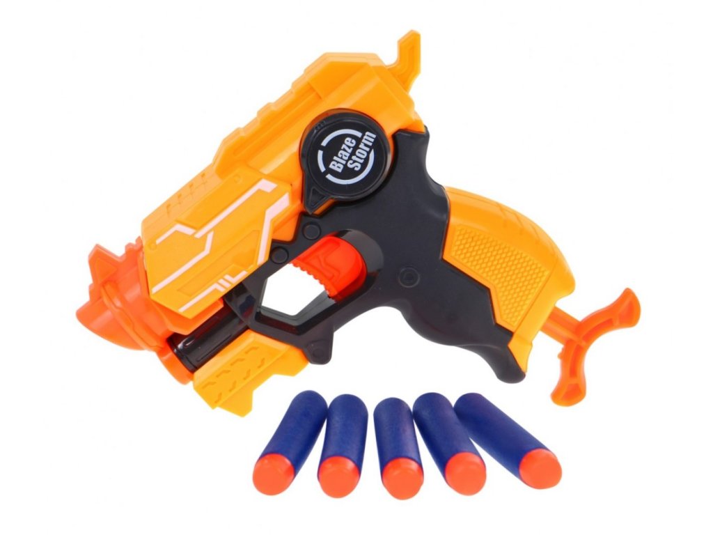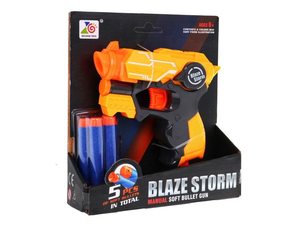 Пистолет Блейз Сторм оранжев е чудесно забавление за всички, които обичат военни играчки. Детски пистолет е много лесен за използване и не изисква батерии. Вкарайте патрон, дръпнете спусъка назад и натиснете спусъка. Меките пяна патрони с гумена върха летят на голямо разстояние.Компактните размери позволяват пистолетът да се носи навсякъде. Играчката развива концентрация върху целта, тренира координацията око-ръка и осигурява много забавление.