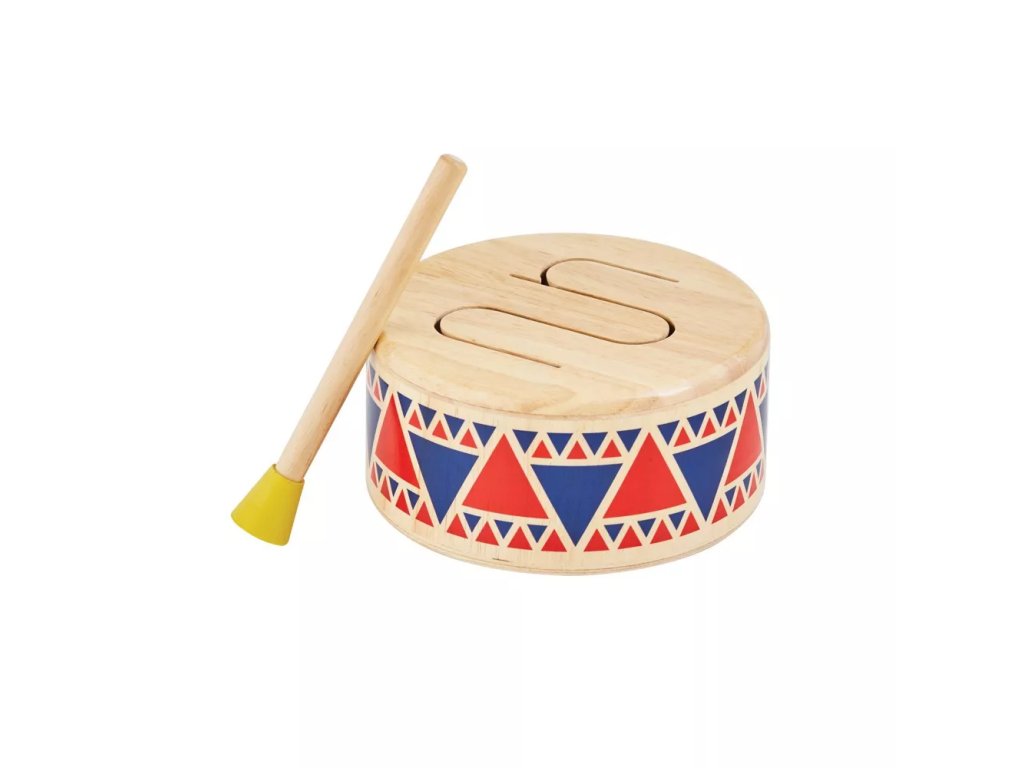 Обикновен и здрав дървен барабан, предназначен за най-малките деца. Барабанът подпомага развитието на фината моторика и слуховото възприятие, а палката с гумена глава осигурява по-мек и приятен звук.