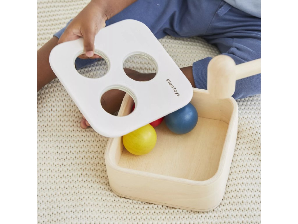 Забавна играчка за забиване, която помага на децата да откриват причината и следствието и да развиват фината моторика. Дървен чук и три цветни топки създават проста и ясна дейност за малки деца.