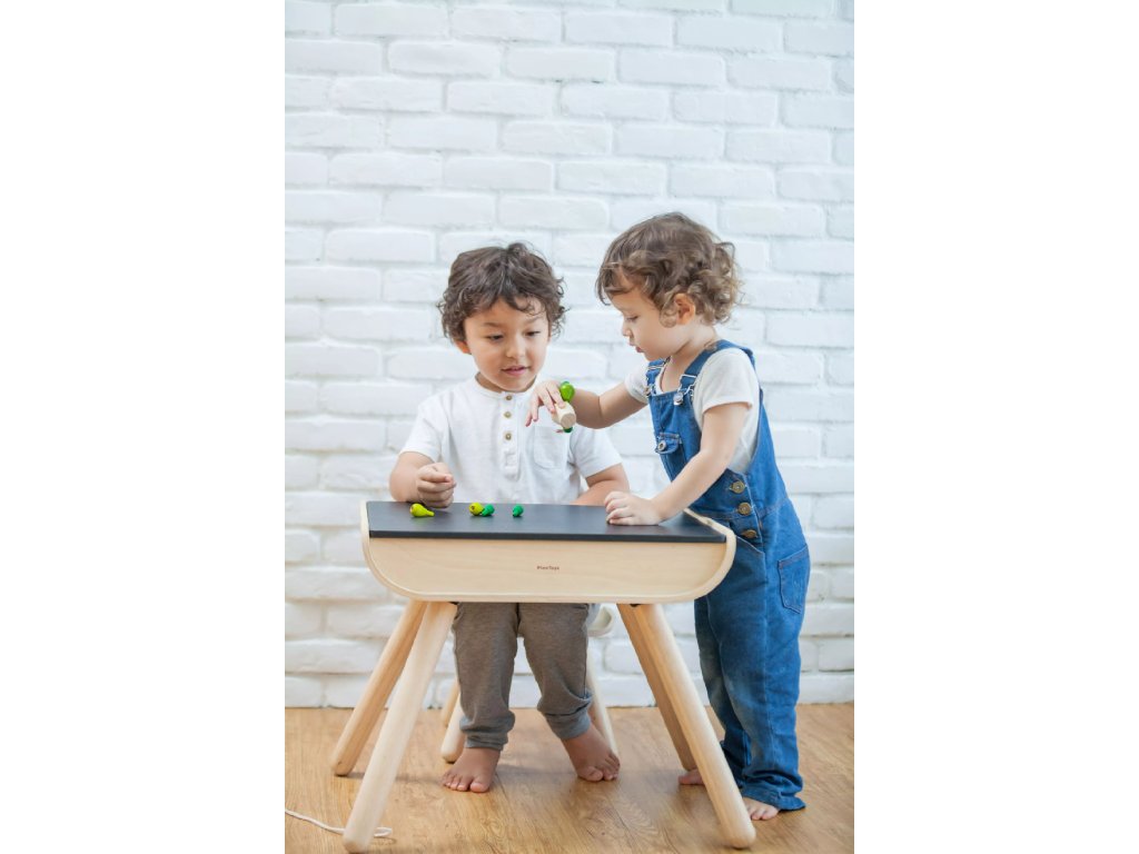 Масичката е изработена от масивно каучуково дърво. Горният плот е от материал PlanWood и е органично оцветен с черен пигмент. Децата могат да рисуват с тебешир върху плота и той може да се избърсва с влажна кърпа. Масичката е със специални размери, така че децата да я достигат свободно. Включва две отделения за съхранение на необходимите неща.