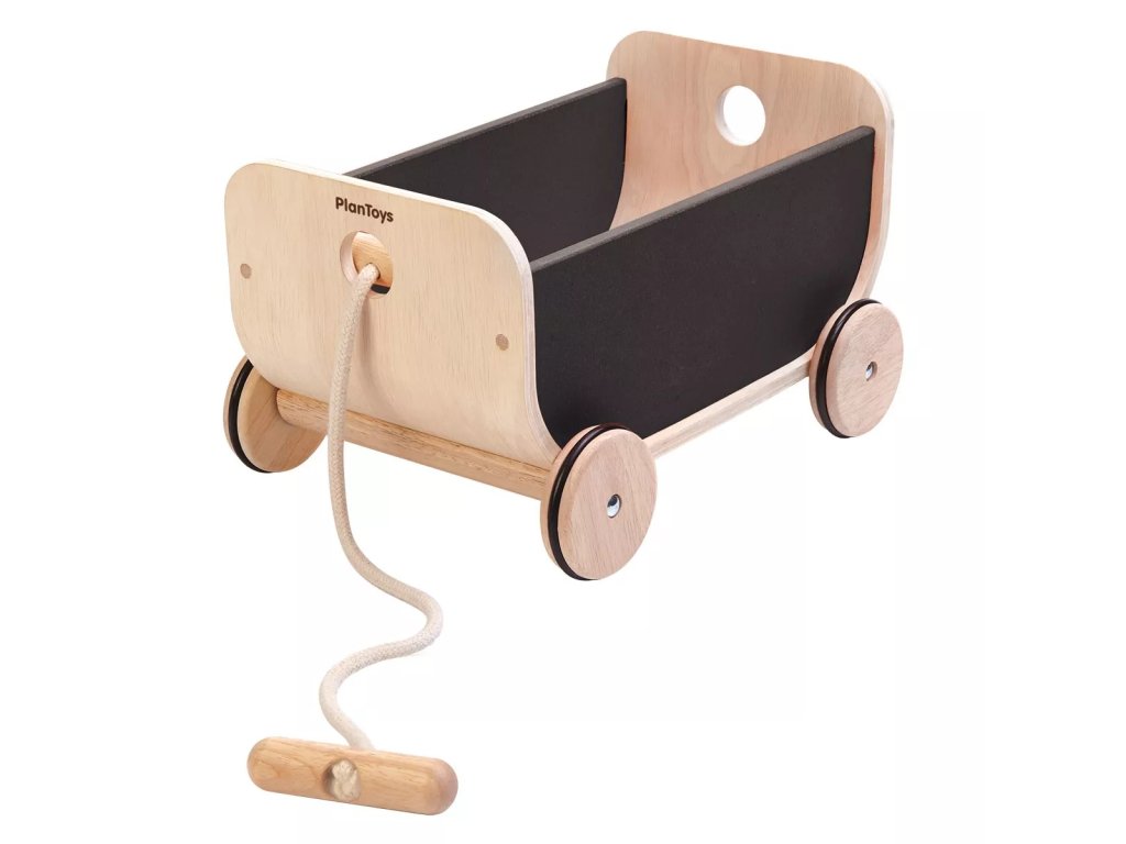 Дървена количка с нежен и същевременно модерен дизайн. Може да се използва като транспортно средство за игра у дома и навън, а също и като място за съхранение на играчки.