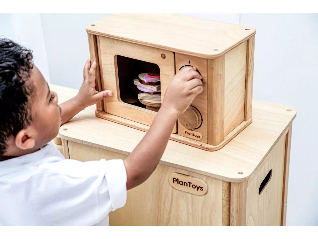 Научете децата на основните функции на домакинските уреди с дървената микровълнова печка от Plan Toys. Играчката е подходящо допълнение към детската стая и подпомага упражняването на обичайни дейности под формата на игра.