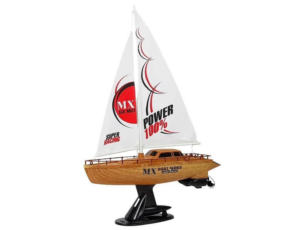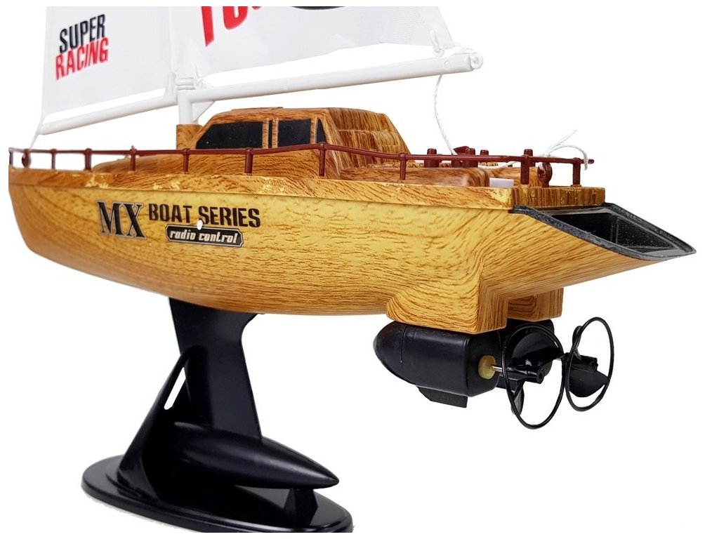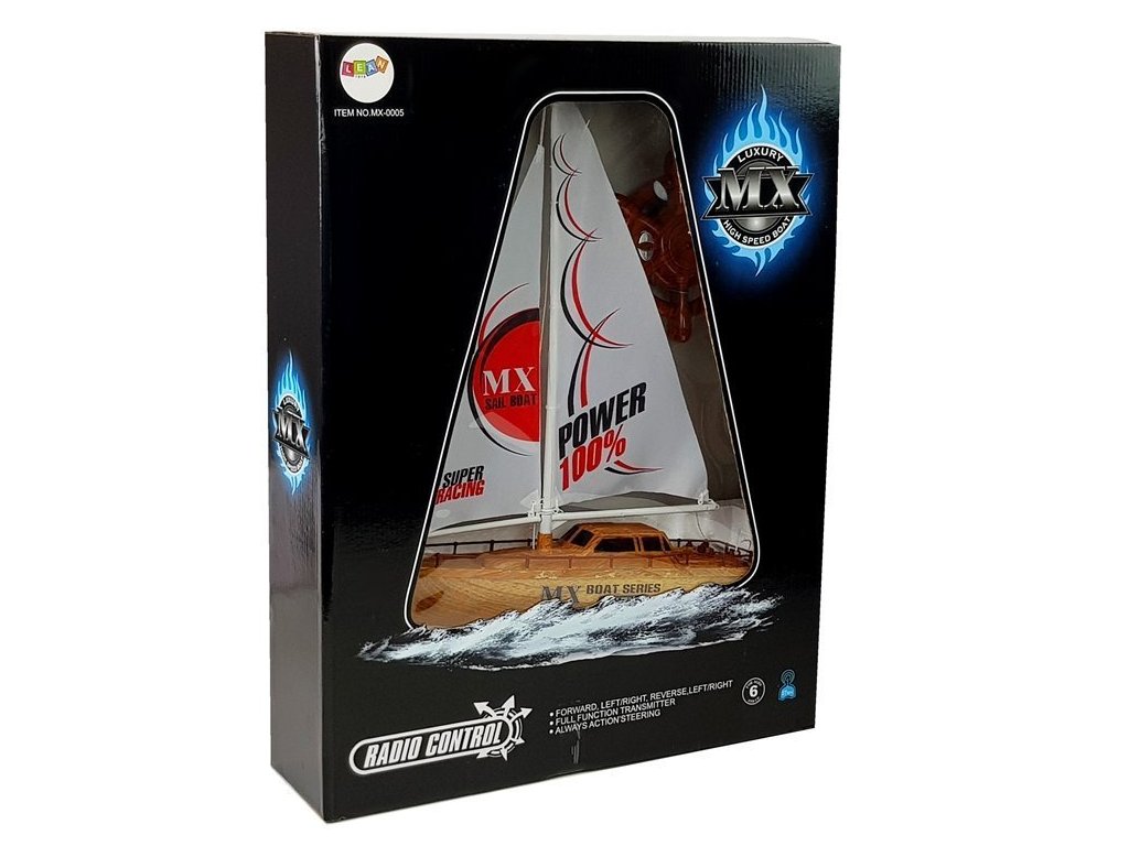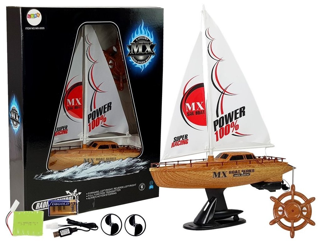 Дистанционно управляваният платноход е изработен от едно цяло парче пластмаса, без отвори, които позволяват навлизане на вода. Всеки детайл, дори платното, е прецизно пресъздаден. Движението по вода се осъществява чрез 2 мотора на задната част на играчката. Корабът се стартира с бутон, разположен на задната му страна, за да не натрапва присъствие. Контролерът е във форма на кормило, така че вашето дете може да стане капитан на собствената си лодка. Той е с антена, която увеличава обхвата на управлението. Може да се управлява напред, да се завърта и да се придвижва странично. След приключване на играта, платноходът може да бъде идеална декорация, благодарение на поставката в комплекта.