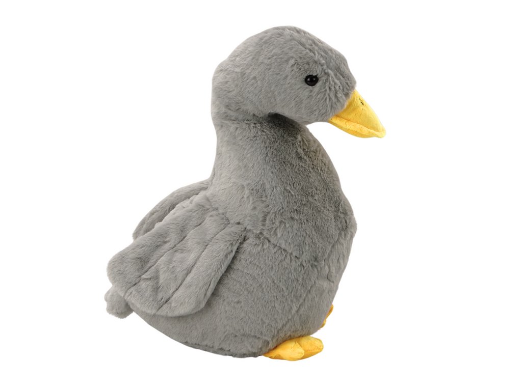 Плюшена гъска в сив цвят, която ще се превърне в отличен приятел за игра и красива декорация в детската стая на вашето дете. Тази симпатична гъска има внушителна височина от 40 см, което я прави достатъчно голяма играчка както за гушкане, така и за мека възглавница. Светлото й жълто клюнче и крачета й придават характер, докато сивите й крила се съчетават хармонично с пухкавото тяло.
