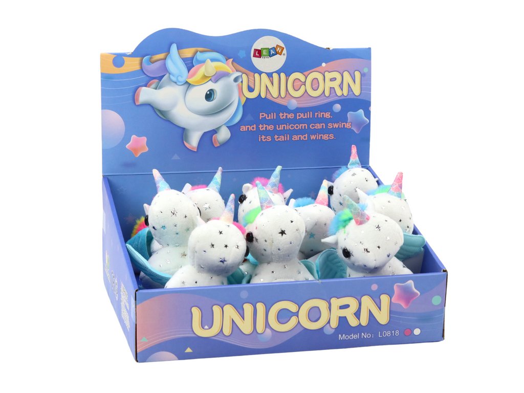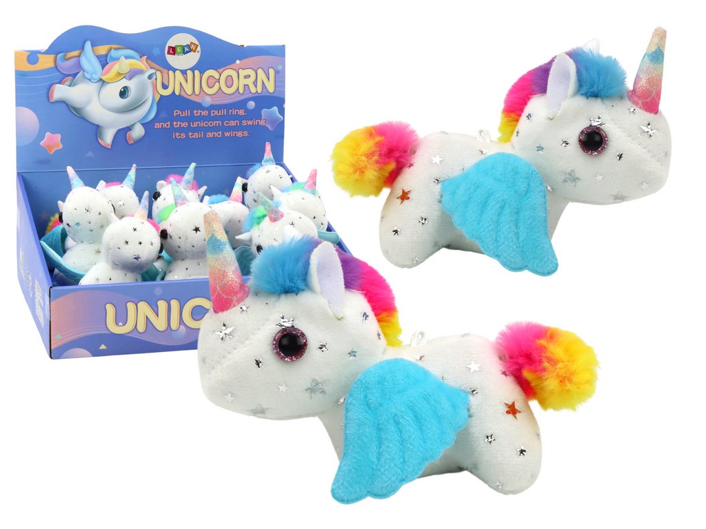 Напомняйки истинско конче от вълшебния свят, нашият плюшен еднорог разполага и с красиви сини крилца, които добавят още повече магия и фантазия. Но това не е всичко! Благодарение на издърпващата връвчица, кончето започва радостно да скача и да мърда опашката си, което прави играта още по-вълнуваща и изпълнена с усмивки.