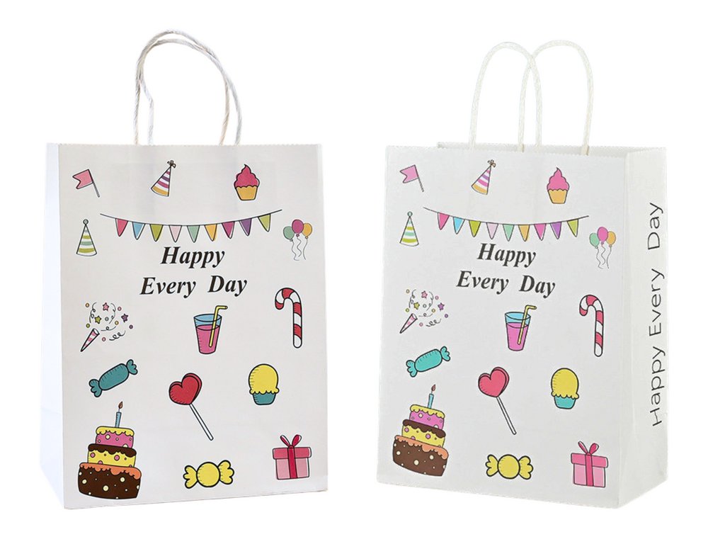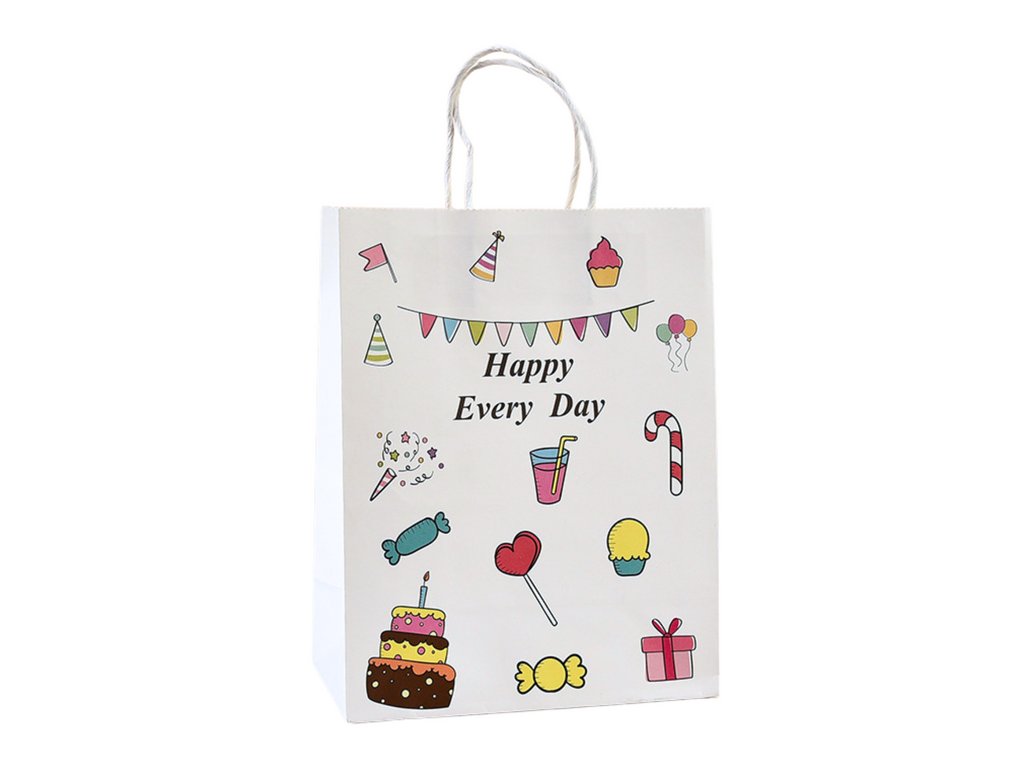Хартиена торбичка с размери 20 см х 15 см, идеална за опаковане на малки подаръци. Декорирана е с ярки графични елементи и носи надпис „Happy Every Day“, което я прави перфектен избор за различни поводи като рожденни дни, партита или срещи с близки.