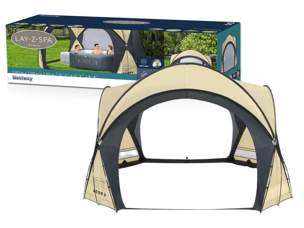 Покривалото за джакузи Altán Bestway 390x255 см е подобно на палатка и разполага с 4 големи джоба за съхранение на лични вещи и 4 подвижни входа от плат и мрежа. Използва се целогодишно. Монтажът е бърз и лесен – отнема само 15 минути. Височината от 255 см позволява удобен достъп до басейна и свободно движение.
