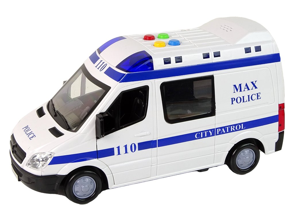 Точно възпроизвежда истинска полицейска кола във всеки детайл. Подвижните части допълнително увеличават стойността на тази играчка. Предните и задните врати могат да се отварят, което позволява качване и слизане от автомобила и организиране на полицейски преследвания. Гумени колела осигуряват отлична стабилност, позволявайки колата да се движи както по гладки повърхности, така и по неравен терен.