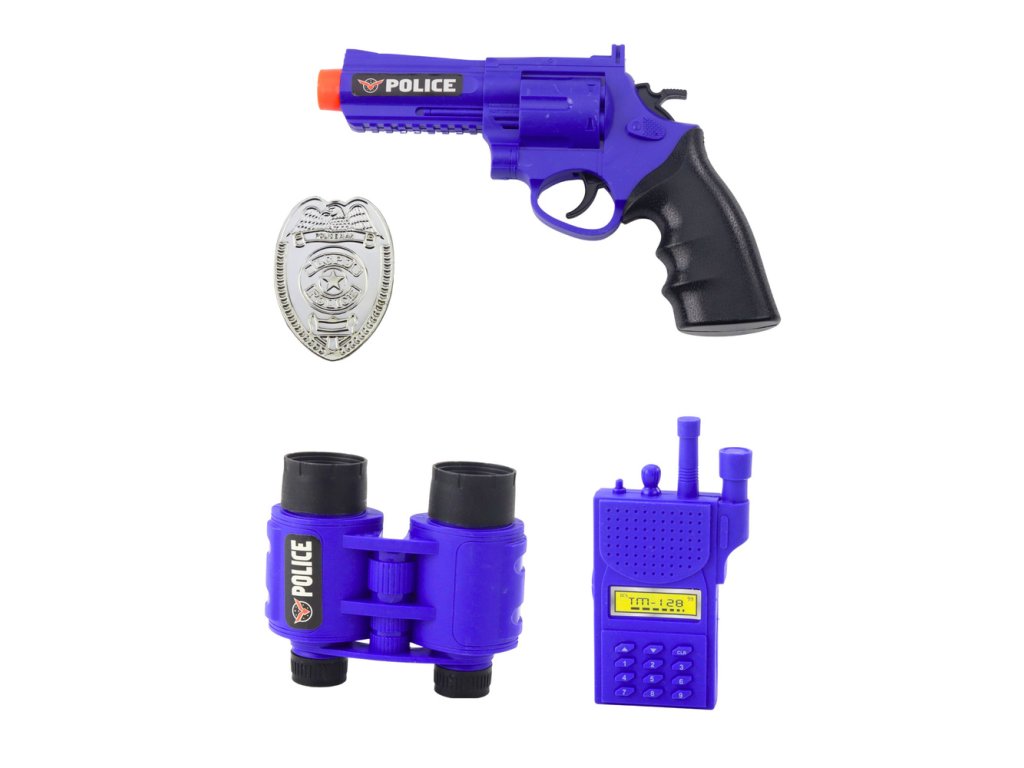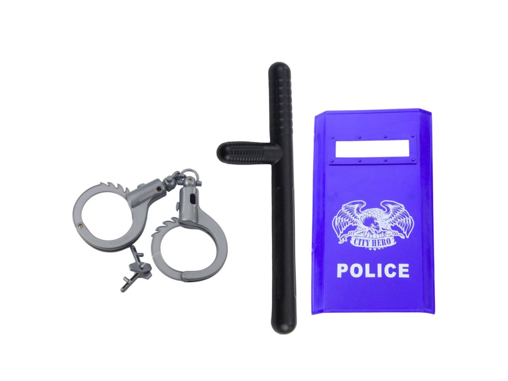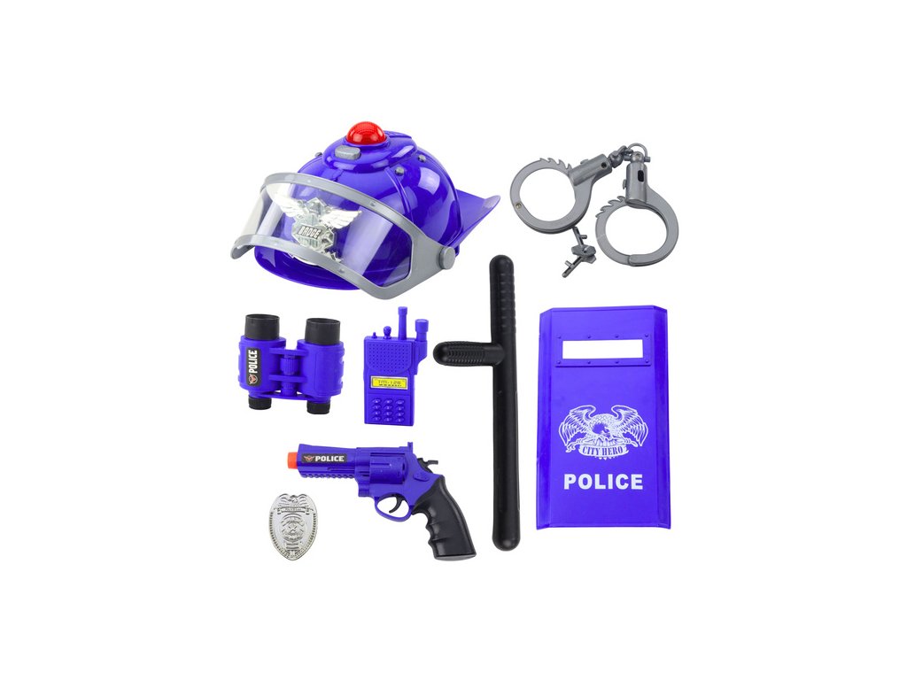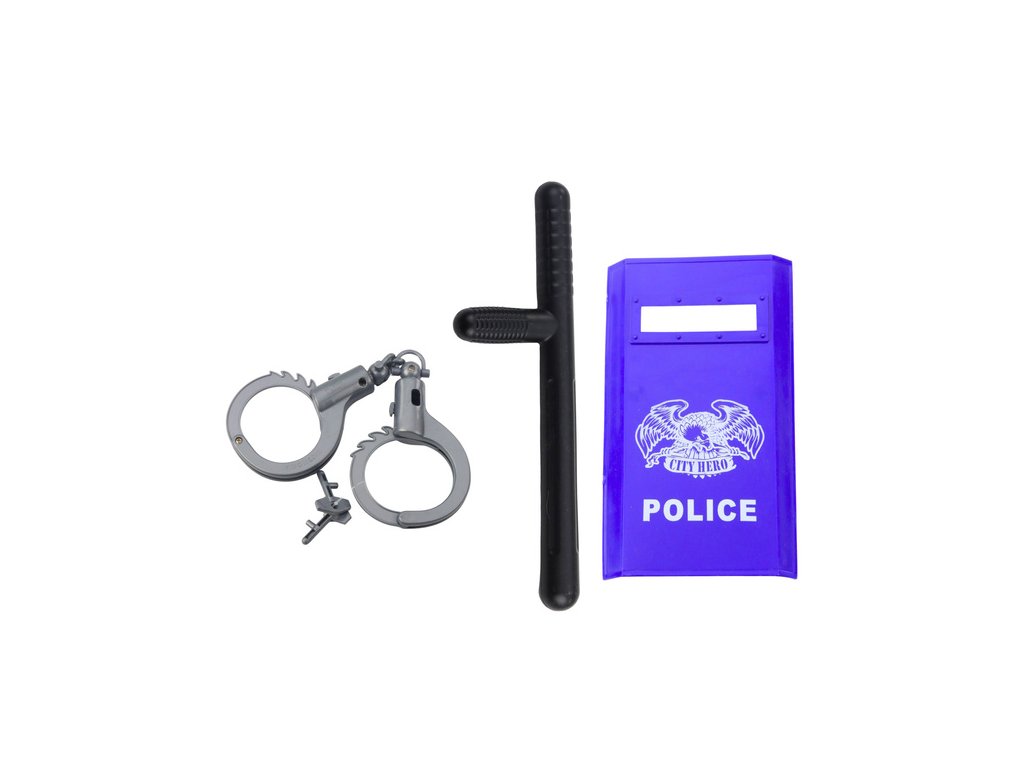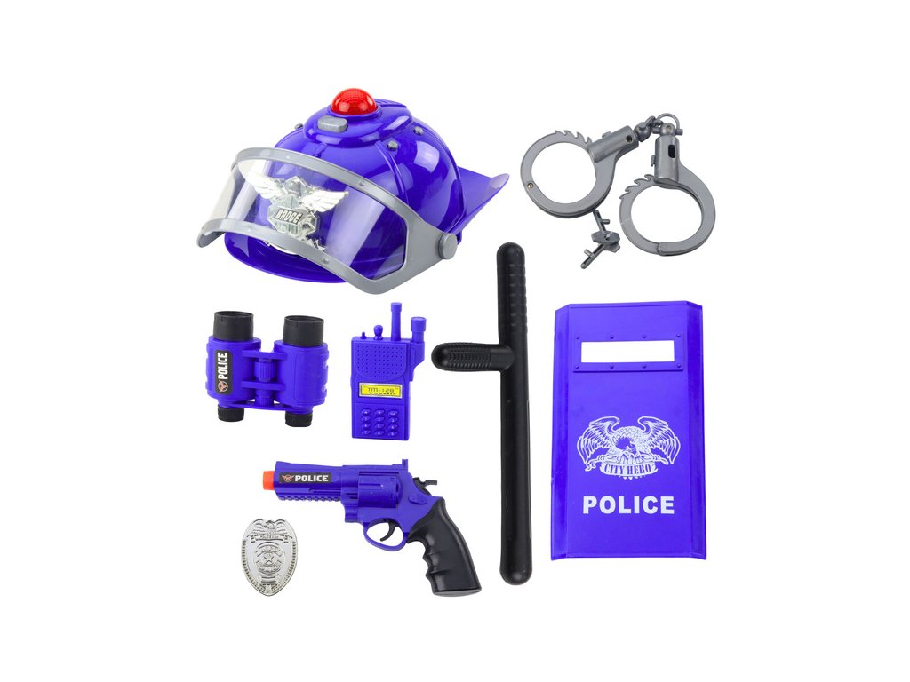 Комплектът съдържа до девет елемента за създаване на редица игрови сценарии. Каска, белезници с ключове, пистолет, бинокъл, радиостанция, палка, щит и значка - всичко това помага на детето да се почувства като истински защитник на реда.