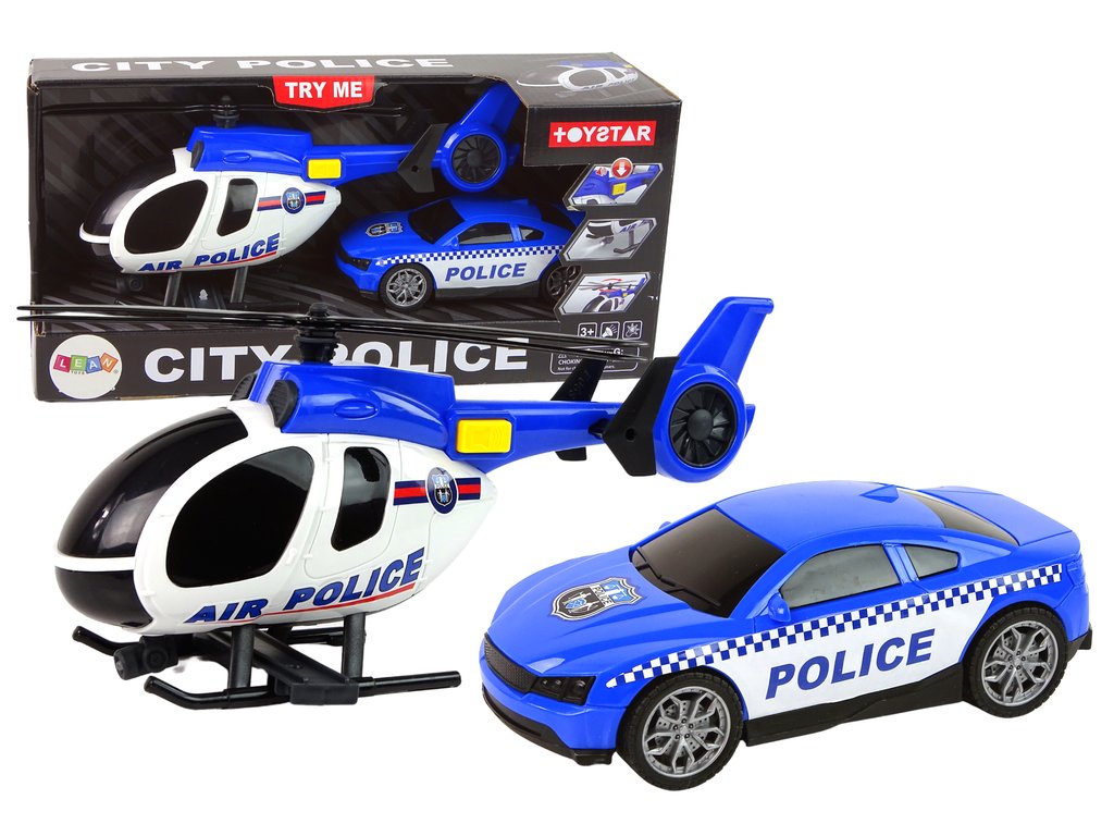 Големият син хеликоптер има подвижни и въртящи се витла. Размахът на витлата е 20 см. Отстрани на хеликоптера има бутон, който активира светлинни и звукови ефекти. Колата е с ярки полицейски стикери, тонирани прозорци и гумени гуми. На равна повърхност достига невероятна скорост. Играчките са произведени от пластмаса, което ги прави леки и напълно безопасни.