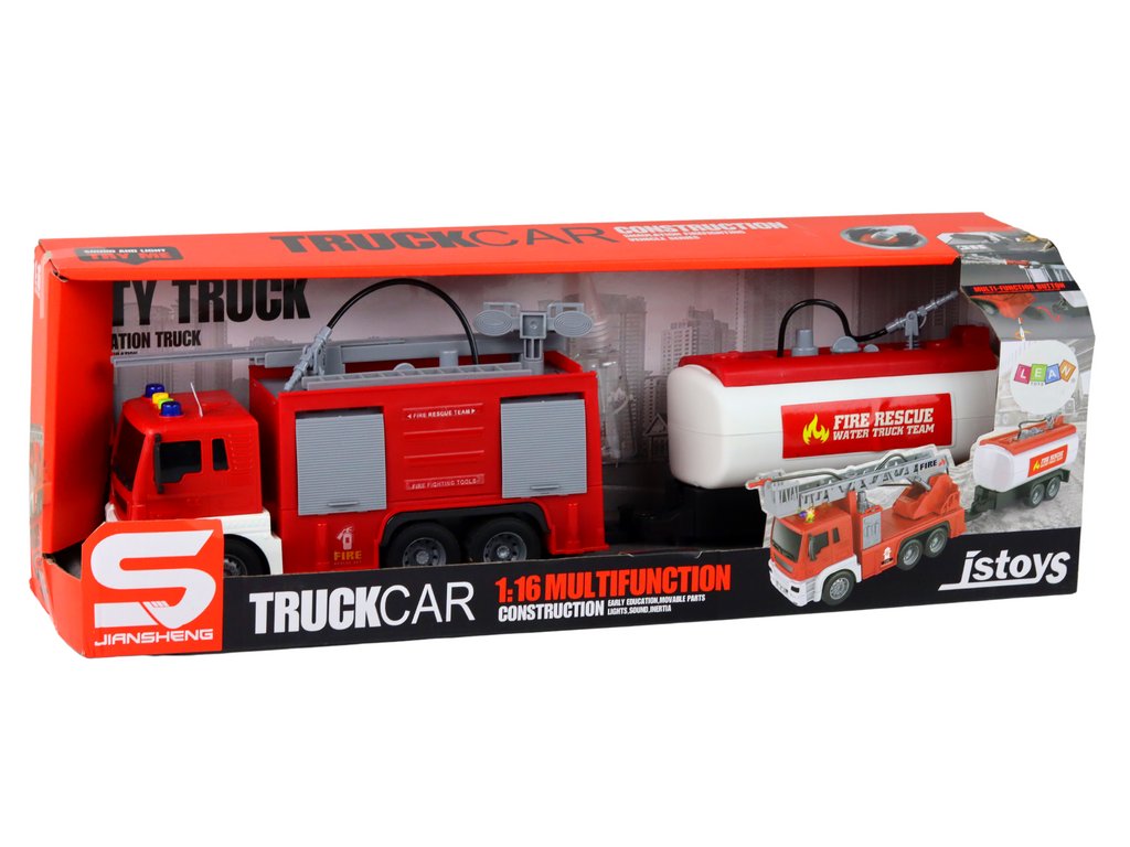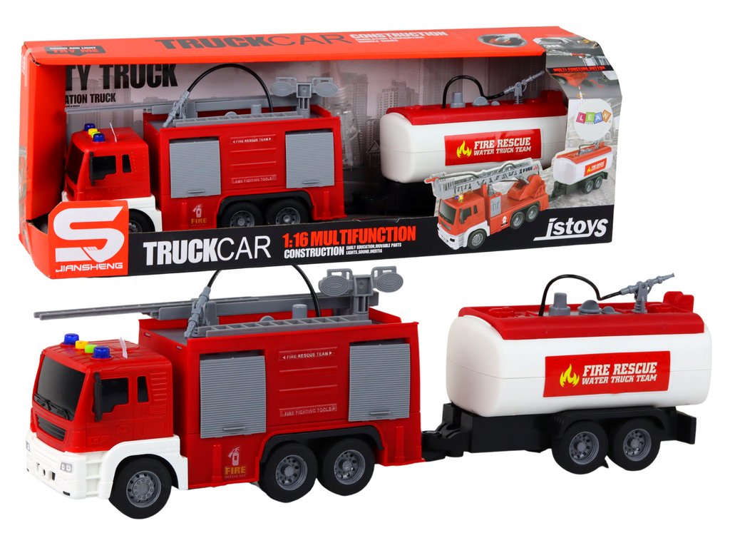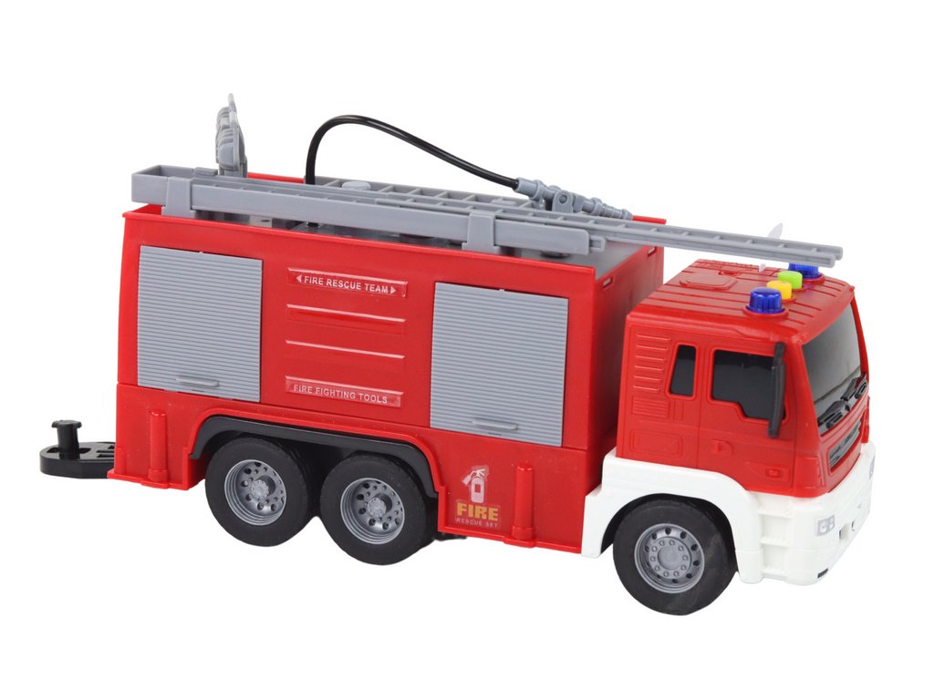 Тази пожарна кола с ремарке 1:16 червена с триене за задвижване е идеална за всички любители на автомобили. Тя предлага редица атрактивни функции, които я правят незабравима играчка. С включените батерии издава реалистични звуци, като клаксона, звук на стартиращ двигател и движение назад, което позволява на децата да се потопят в ролята на истински шофьор.
