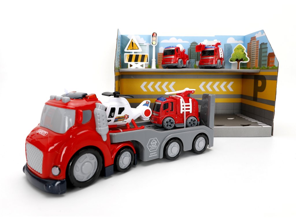 Голям комплект пожарни превозни средства за малки спасители! Червен влекач с ремарке превозва хеликоптер и две пожарни коли, така че децата могат лесно да симулират действия и операции по спасяване. Играта е допълнена със светлинни и звукови ефекти, които допълнително оживяват забавлението.