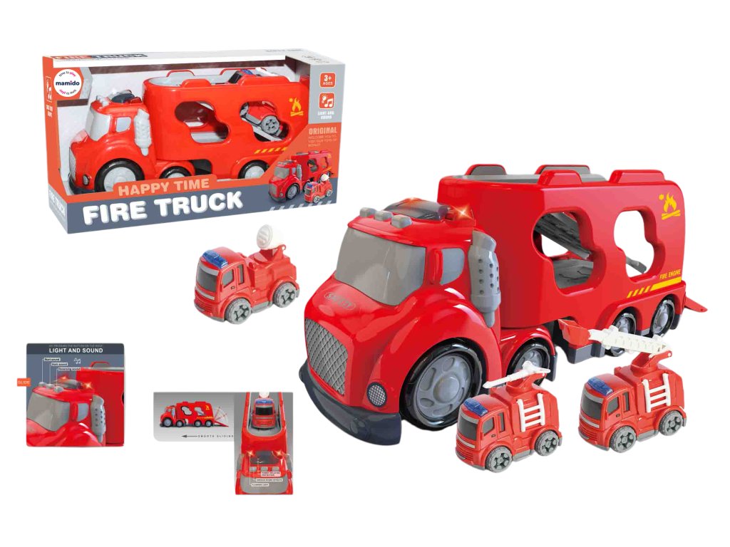 Големият червен пожарен камион ще се погрижи за спасителни операции в детския свят на игрите. Играчката комбинира светлинни и звукови ефекти, които ще добавят реализъм към играта – има стартов звук, клаксон и звук при движение назад. Комплектът включва и две малки пожарни колички, които могат да се превозват вътре в камиона.